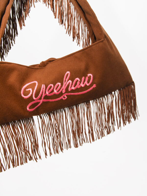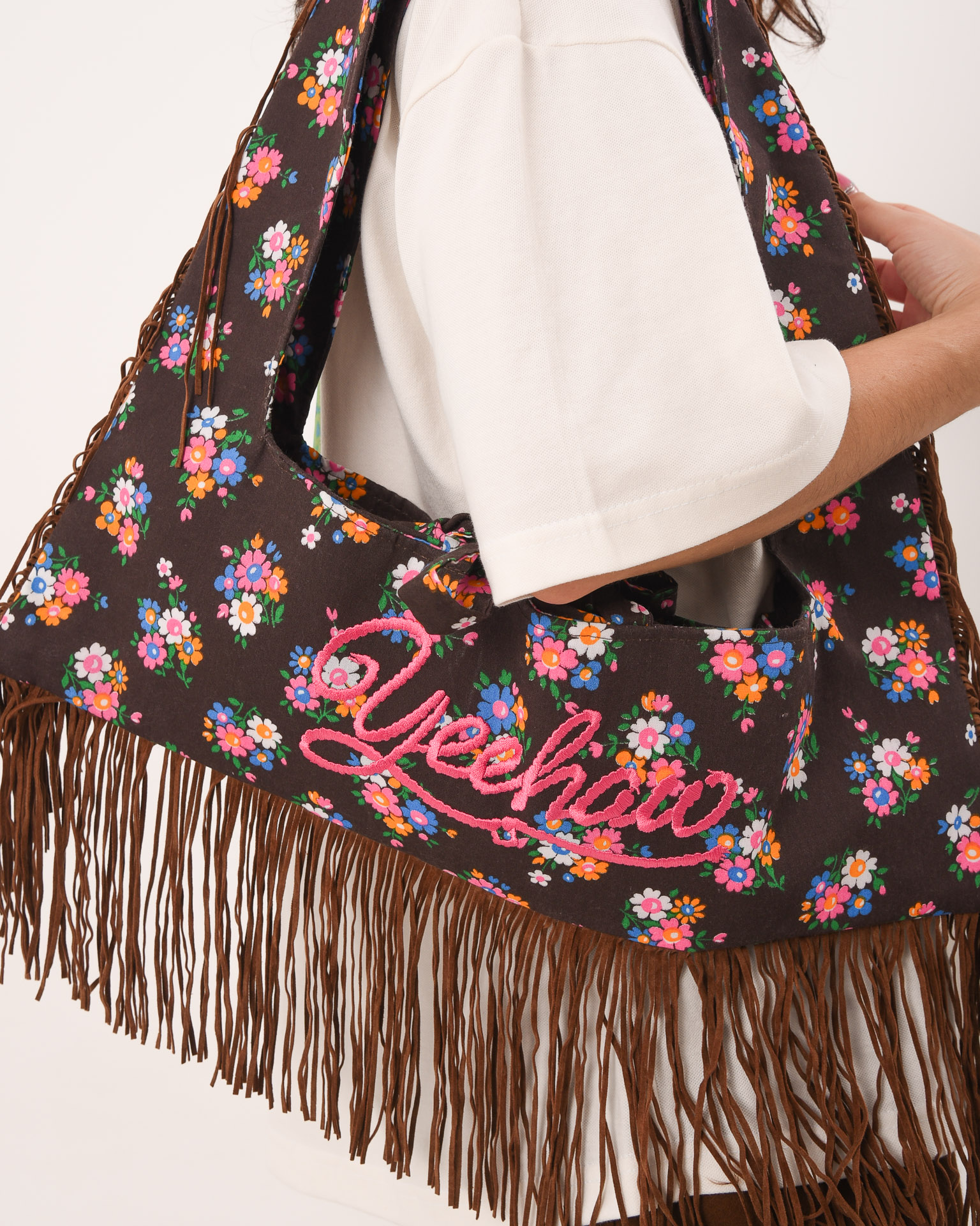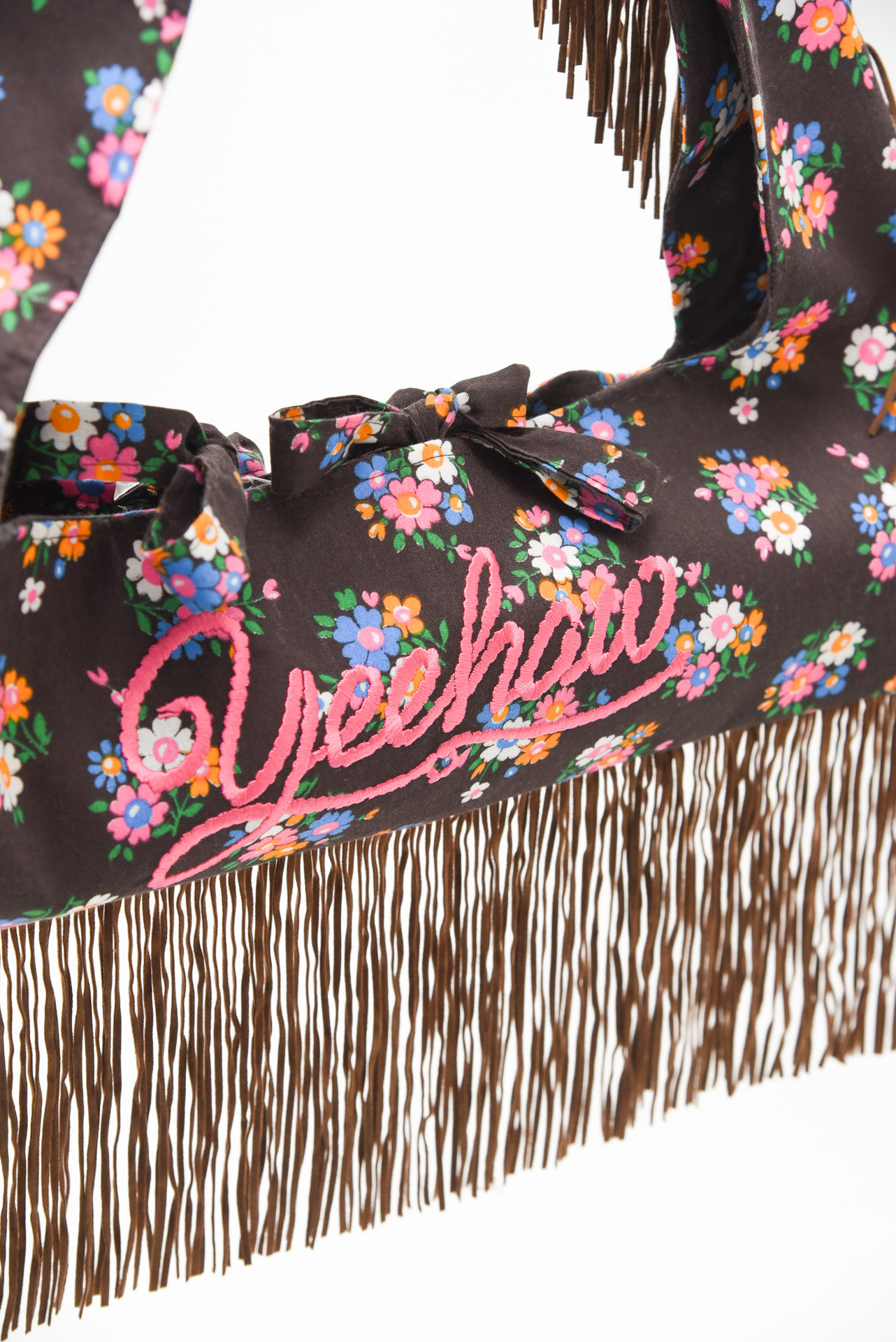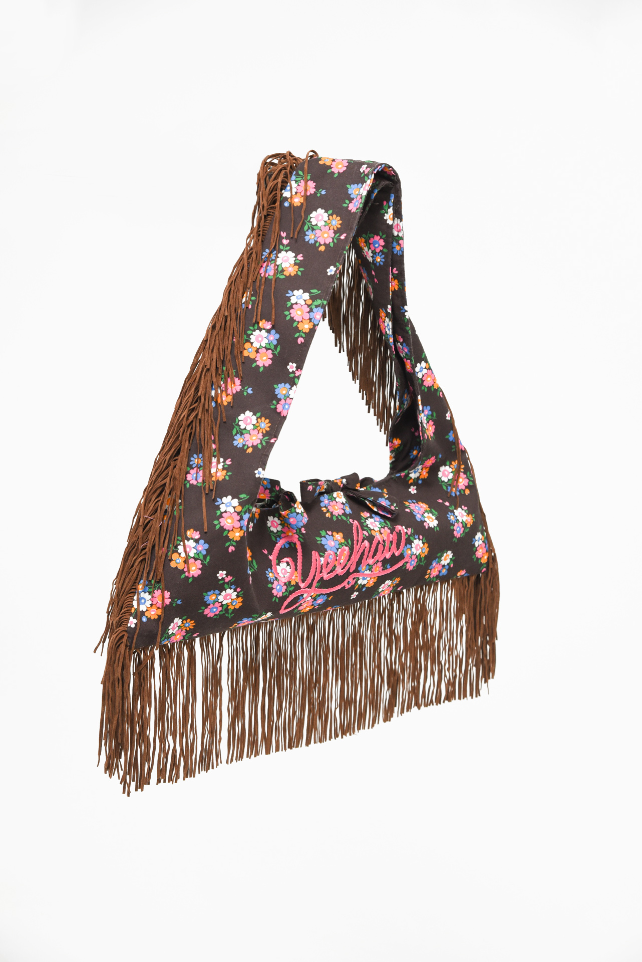 A little Western, a little wild. The Yeehaw Mini Bloom Bag takes cowgirl energy and spins it into something sweet and sassy. Crafted from floral upcycled fabric with playful fringes and embroidered with a bright “YEEHAW”, it’s a wink to rodeo nostalgia and a nod to modern fun. Small in size but big in personality, it’s the perfect sidekick for adventures and nights that end under neon lights.
