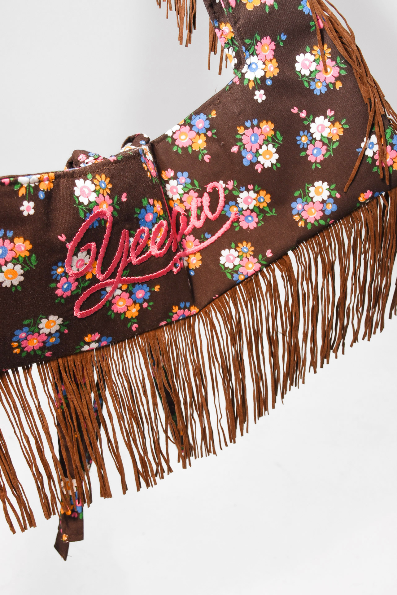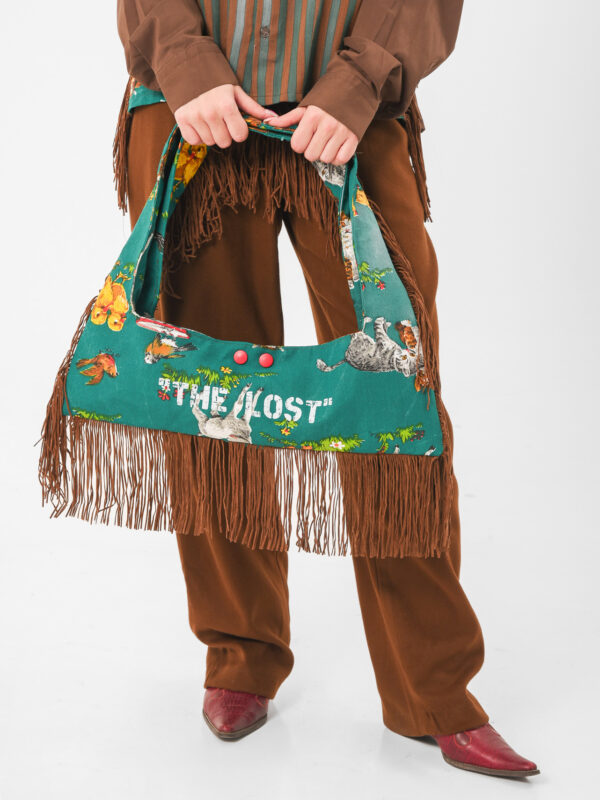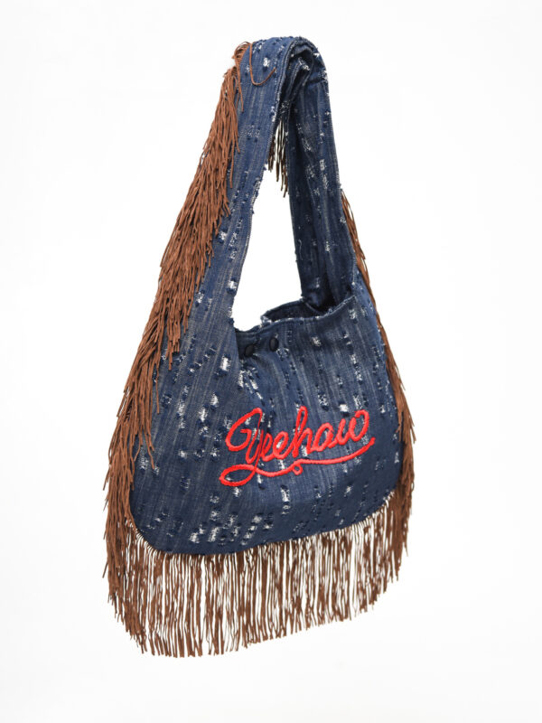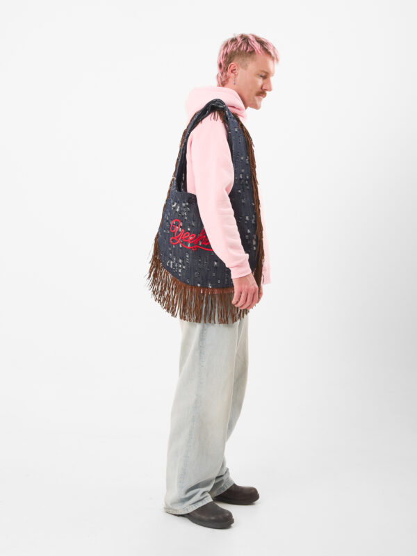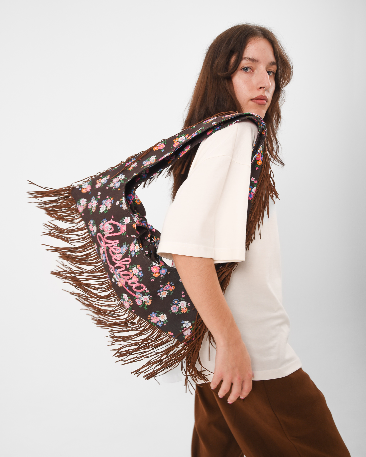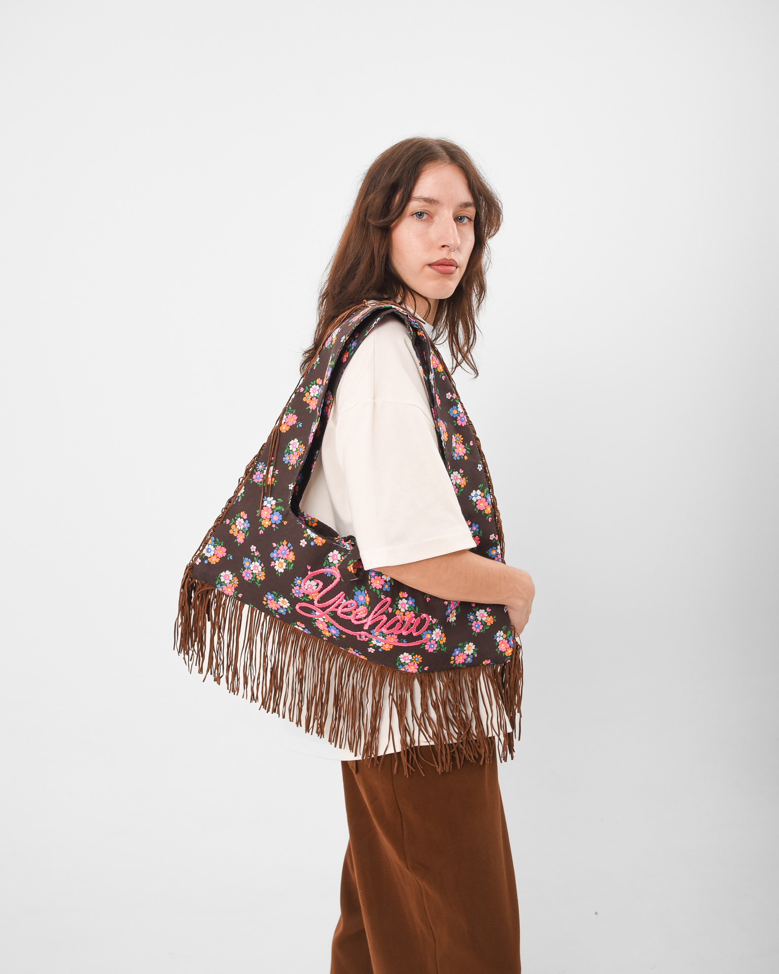 A little Western, a little wild. The Yeehaw Mini Bloom Bag takes cowgirl energy and spins it into something sweet and sassy. Crafted from floral upcycled fabric with playful fringes and embroidered with a bright “YEEHAW”, it’s a wink to rodeo nostalgia and a nod to modern fun. Small in size but big in personality, it’s the perfect sidekick for adventures and nights that end under neon lights.