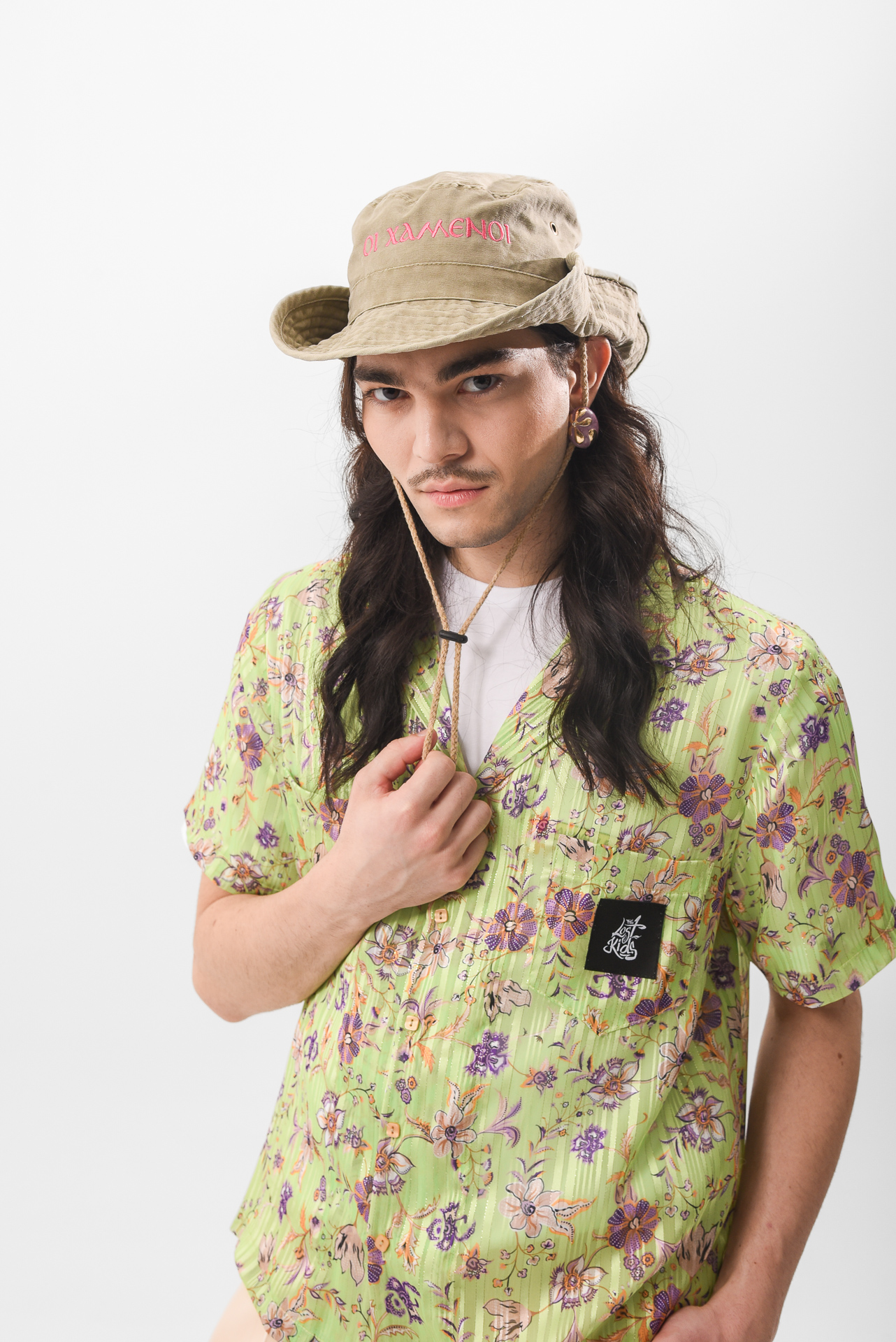 The ΔΕ ΛΟΣΤ Hat is a safari-style piece in bush tones, carrying a small embroidery that reads “Οι Χαμένοι” the lost.