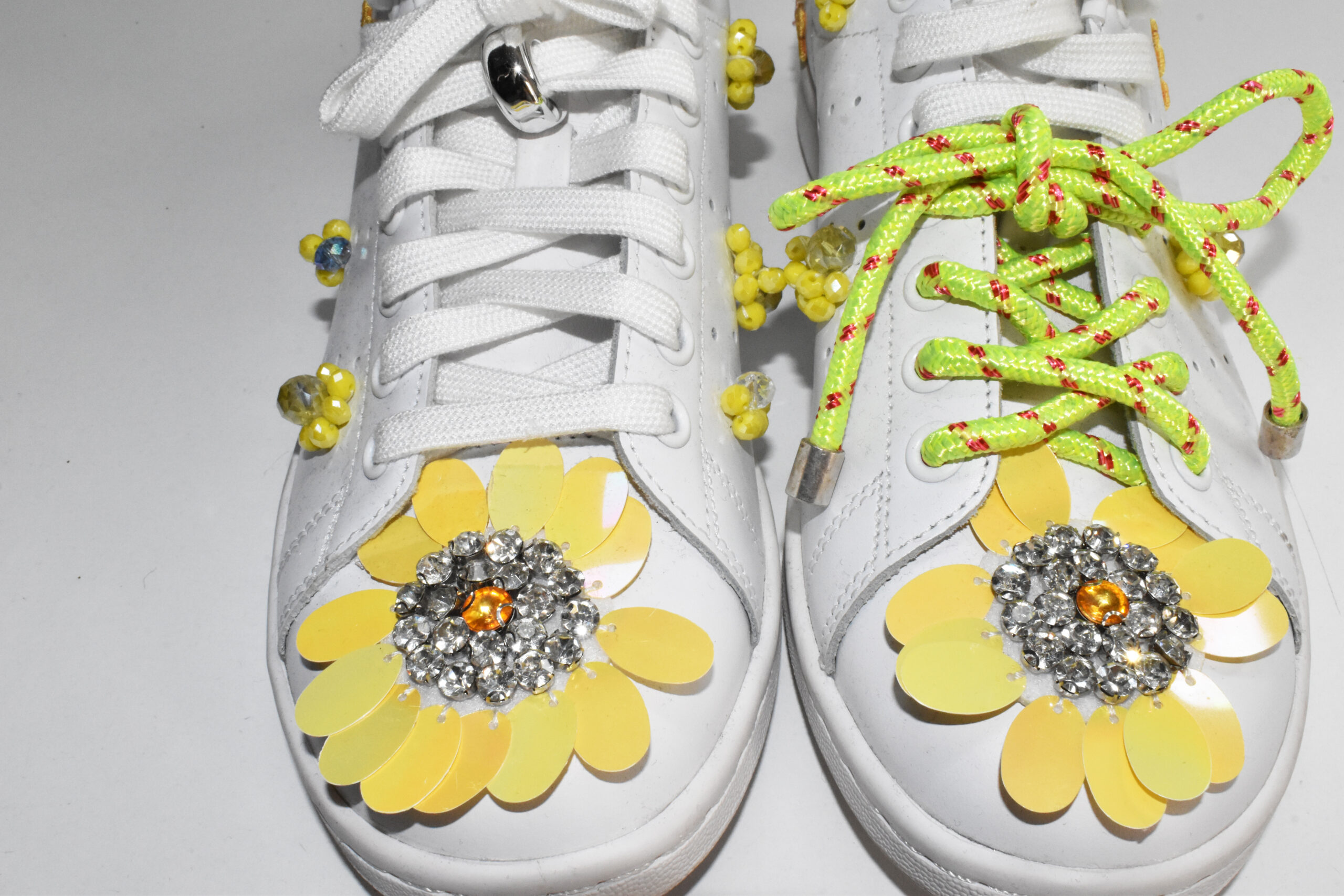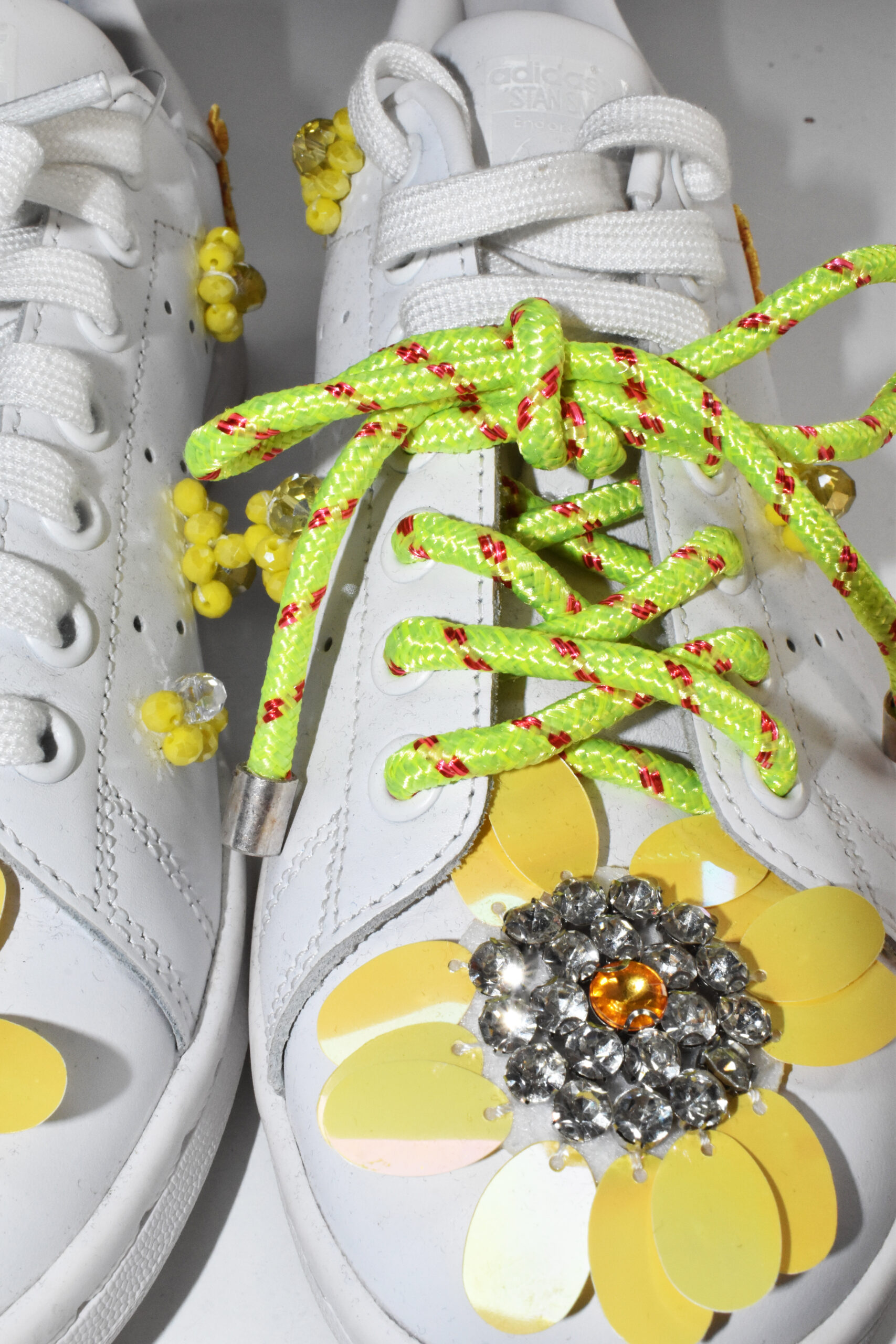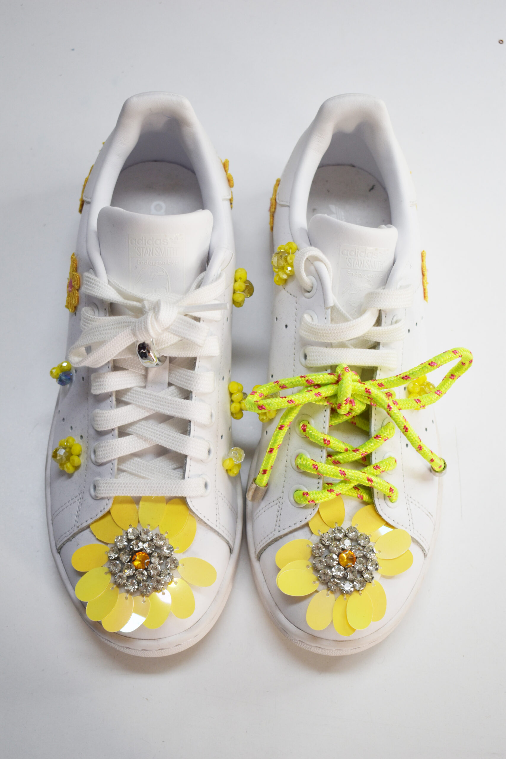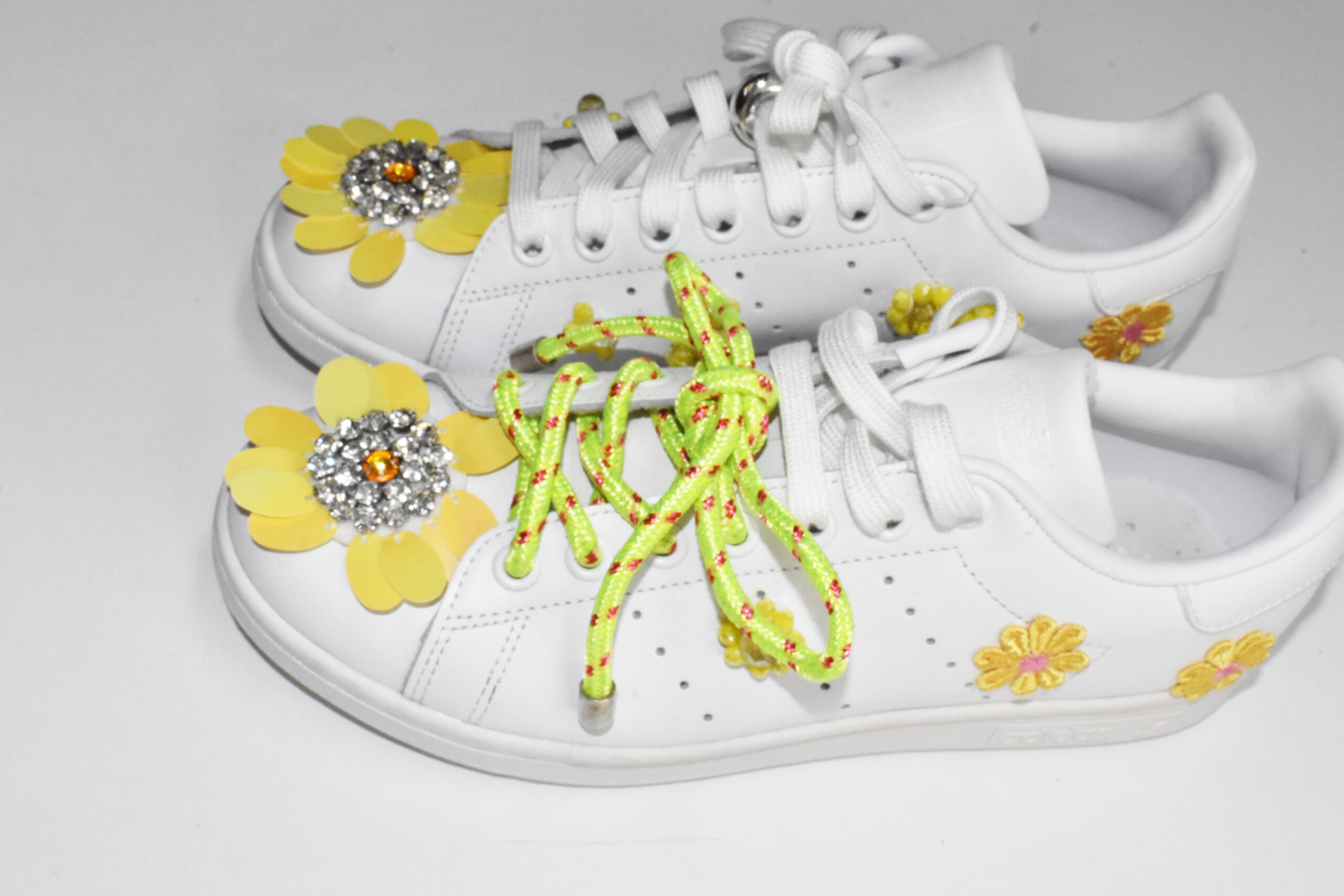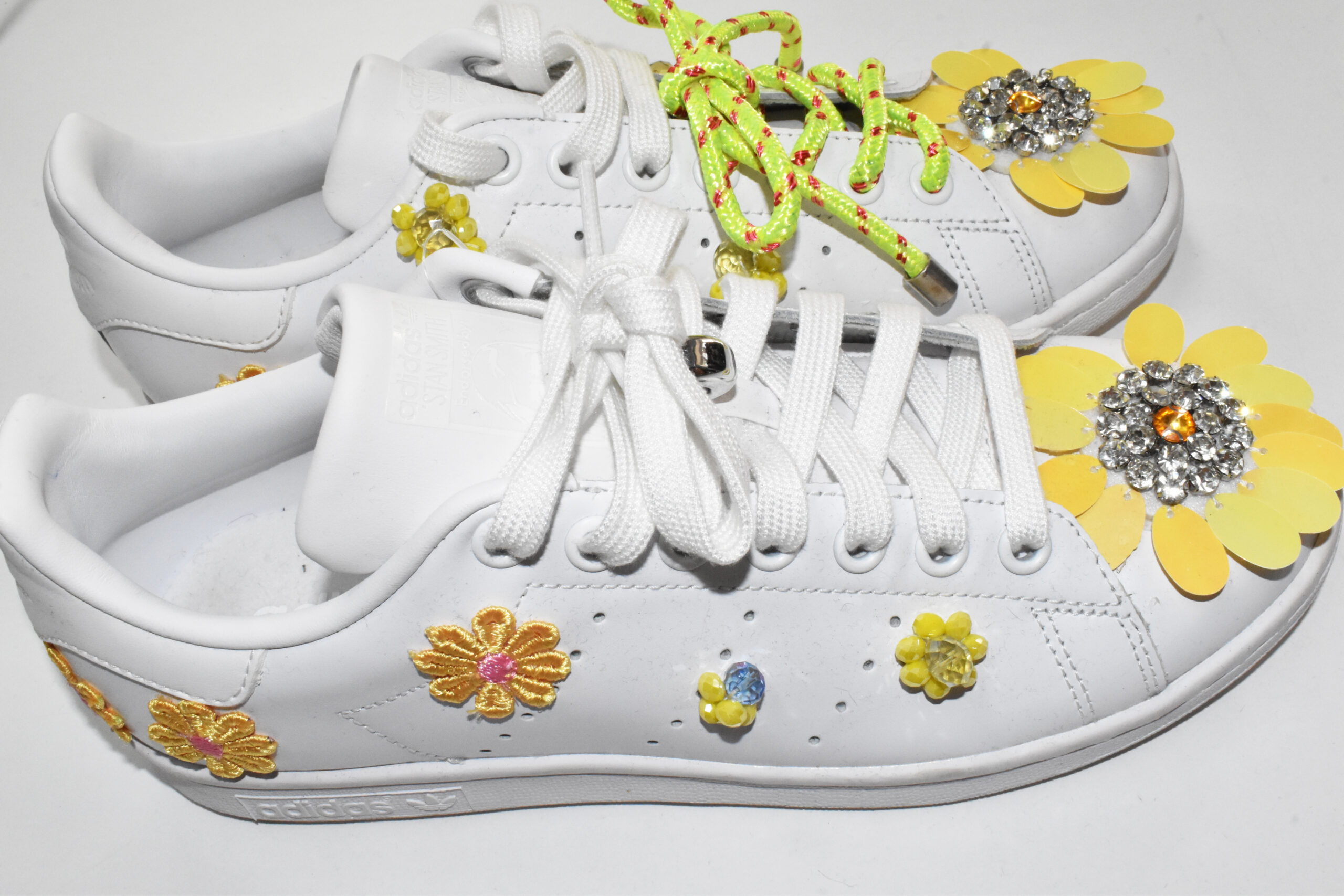 Classic court style with a fresh bloom. These Adidas Stan Smith ‘Triple White’ sneakers are unworn but rescued from waste due to a subtle sole color defect. Upcycled with a deli