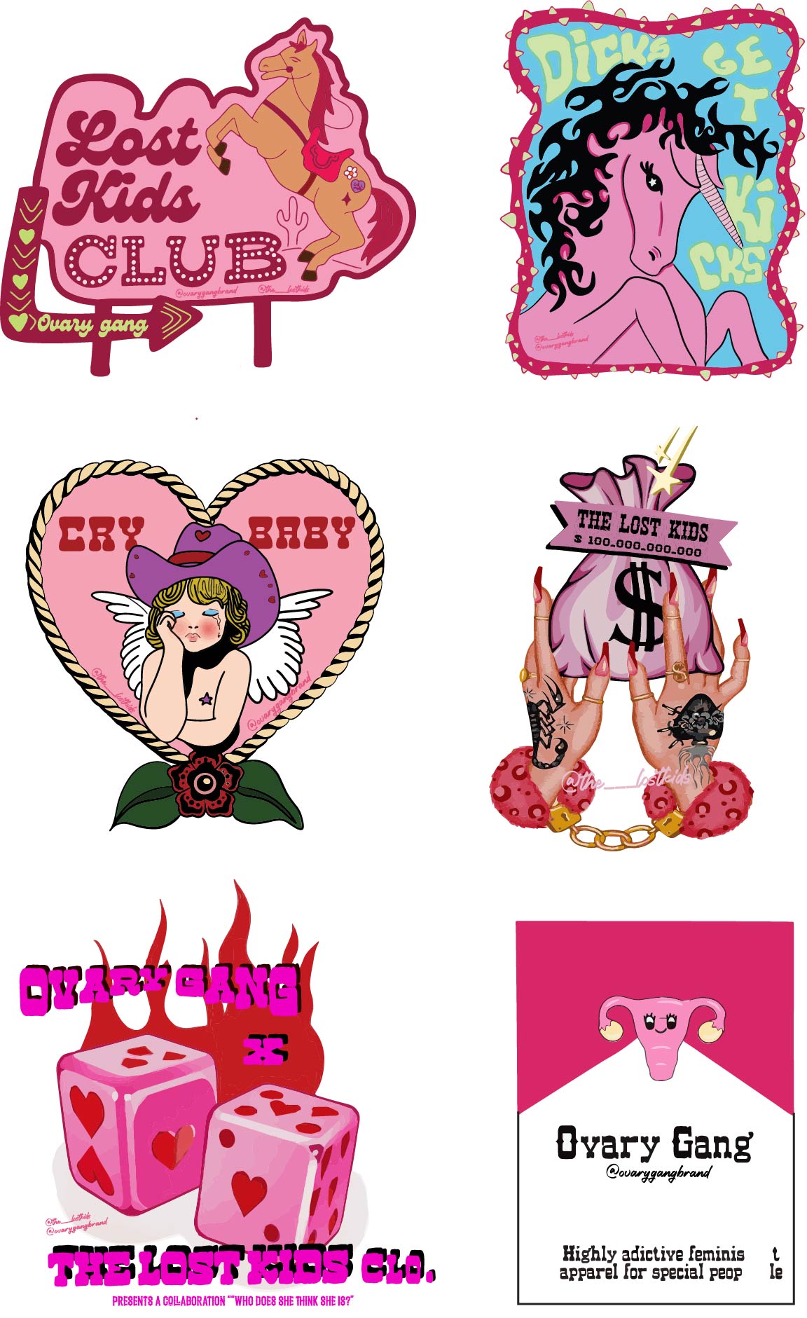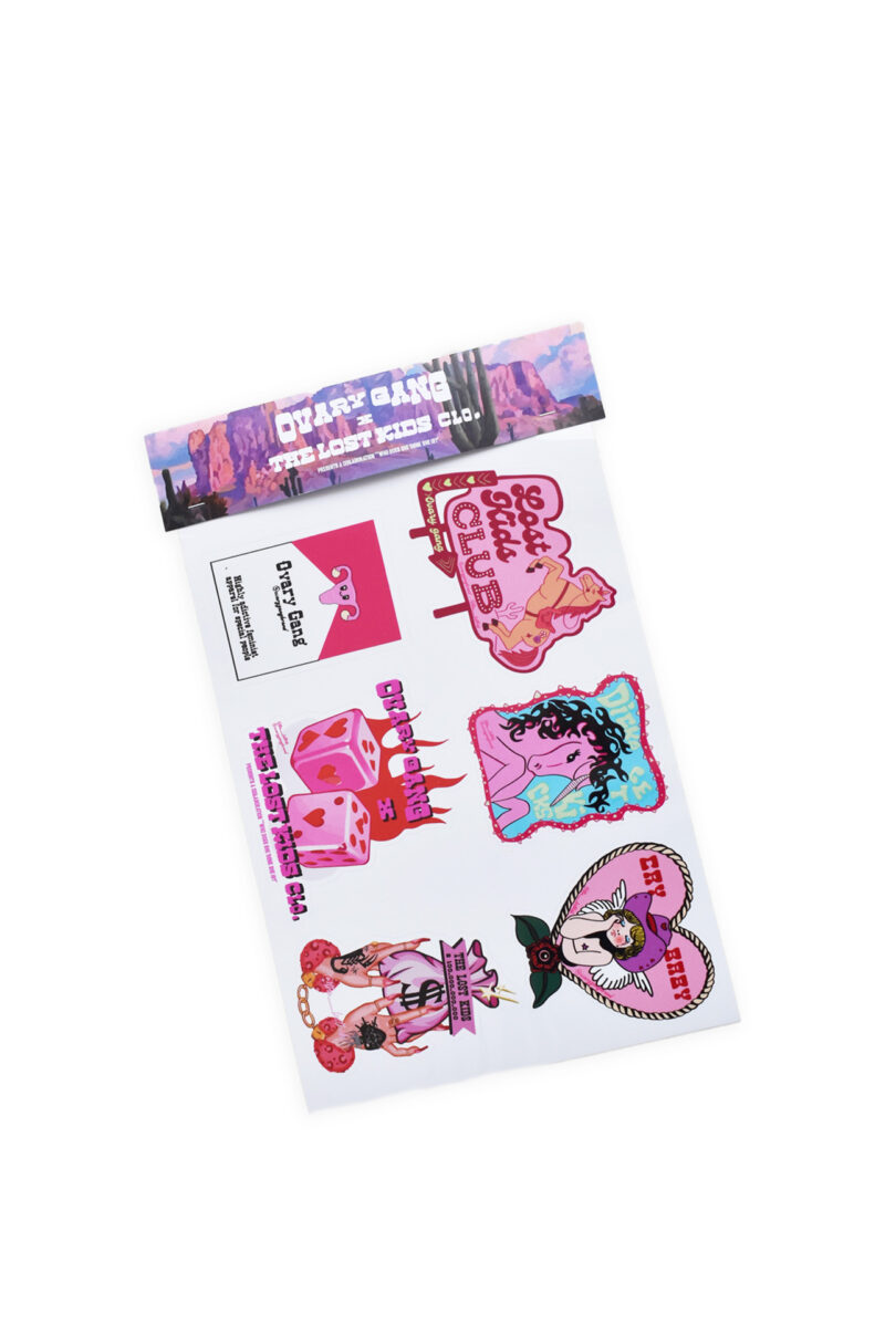 Ride or stick. The Wild Sticker Pack gathers the boldest cowgirl illustrations from The Lost Kids x Ovary Gang collab, Horses, outlaw bounty Marlboro pack, diner signs, fire dice, hearts, and wild western icons reimagined with rebellious flair. Each sticker captures the spirit of the outlaw girl: fearless, funny, and free.