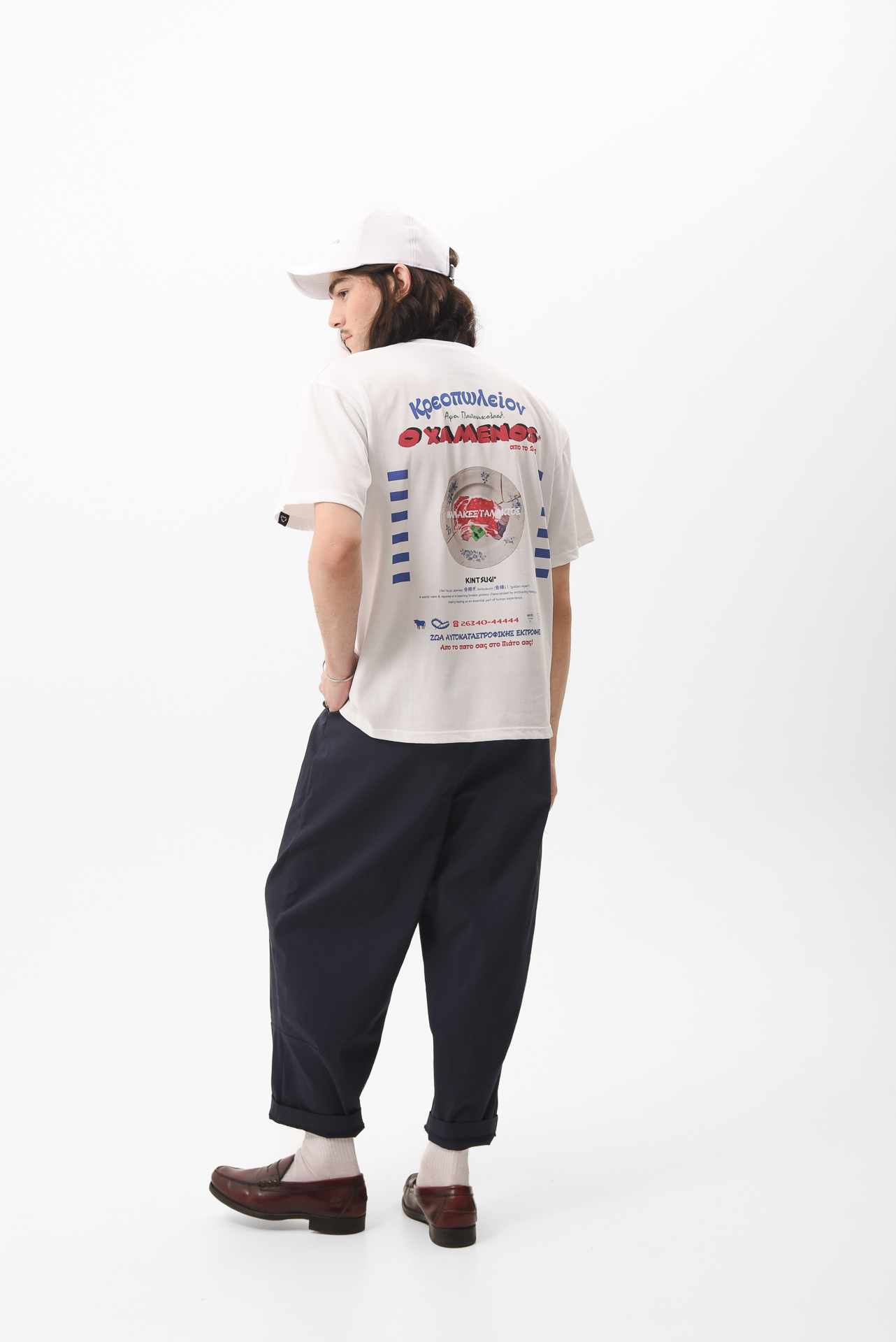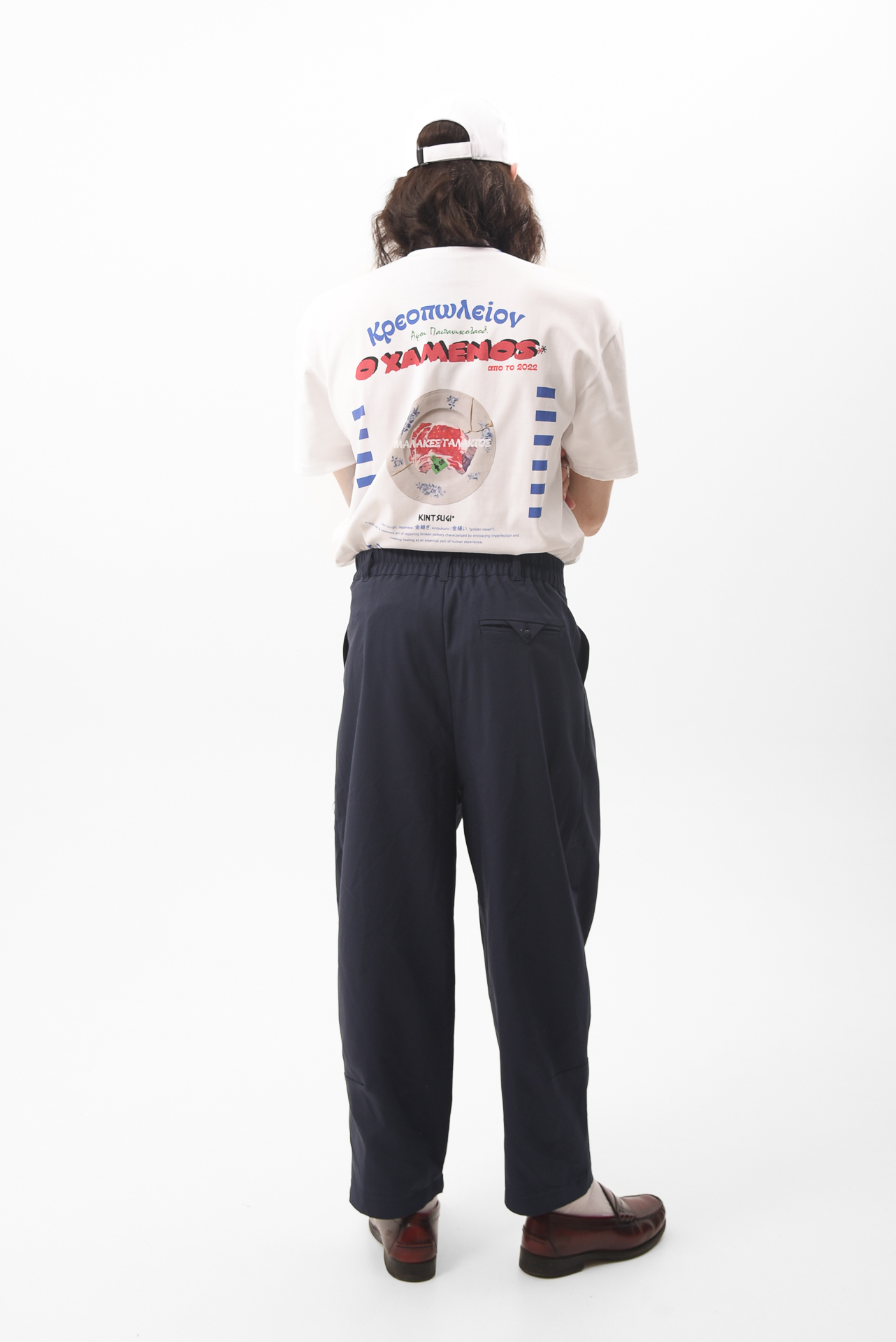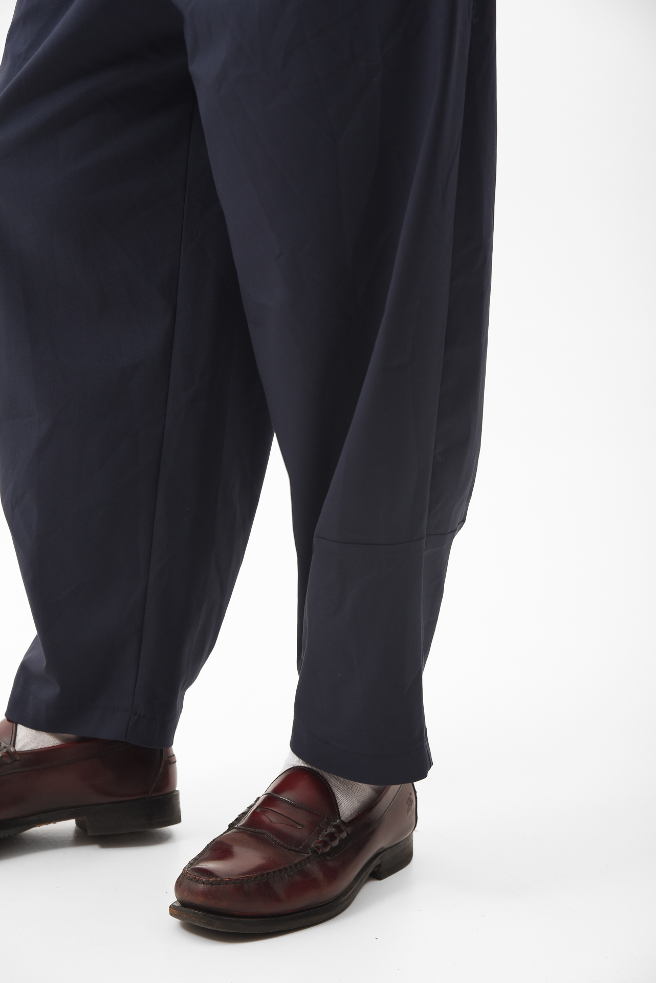 Cut in olive green suit fabric with a loose, pleated fit, they hold that history without repeating it. The volume remains, but the intention shifts — from power to ease, from control to flow.