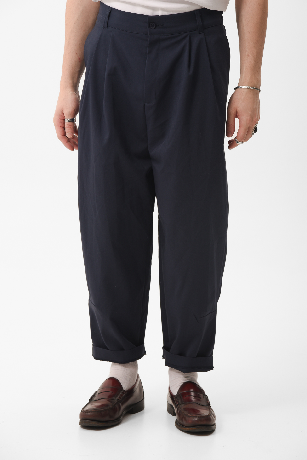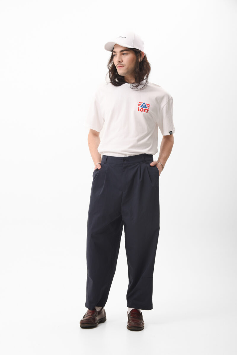 The Arabella Navy-Bue Pants draw from a long lineage, pleated trousers that have moved through decades, from early tailoring to the silhouettes of the 30s, the ease of old cinema, and the boldness of 80s power dressing.