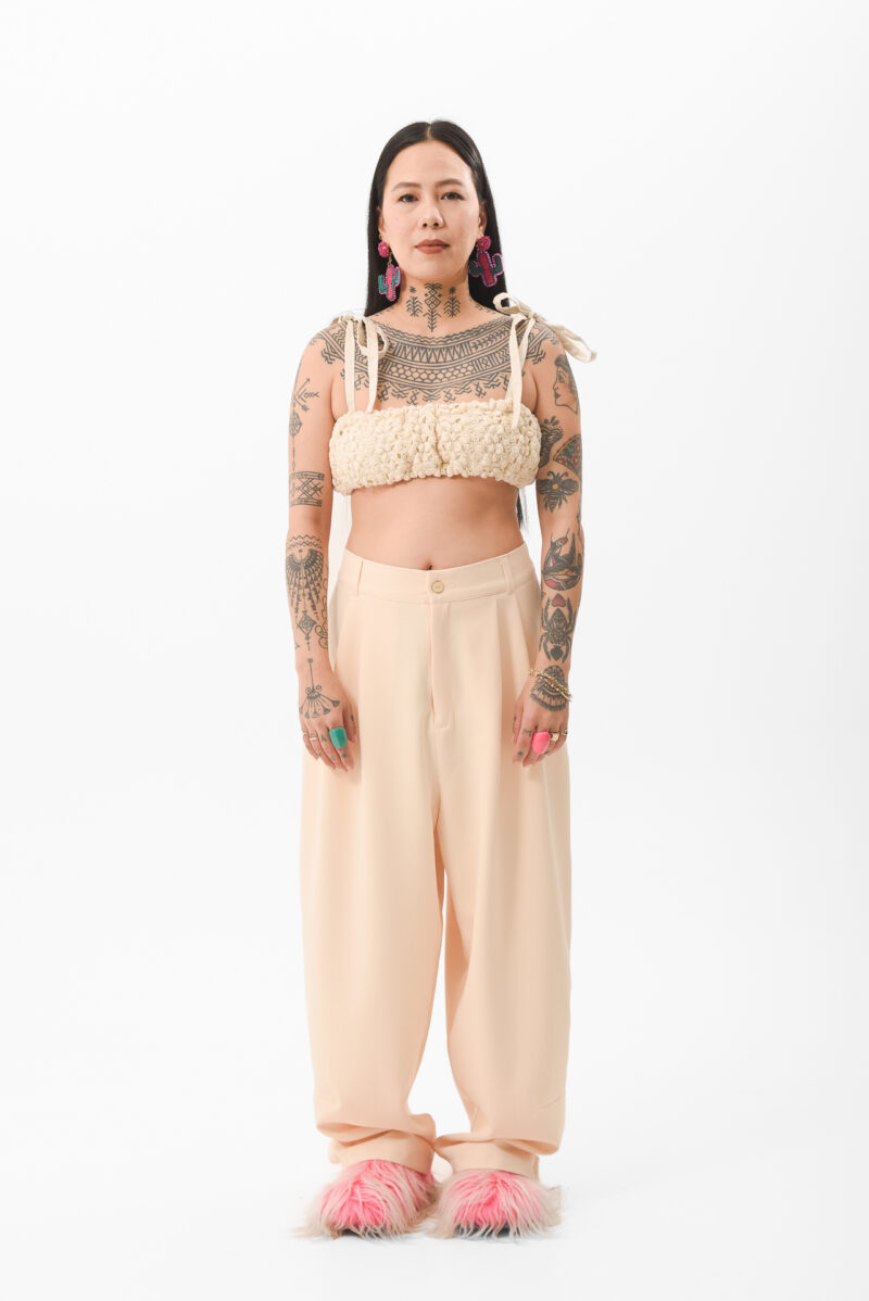 Cut in olive green suit fabric with a loose, pleated fit, they hold that history without repeating it. The volume remains, but the intention shifts,from power to ease, from control to flow.