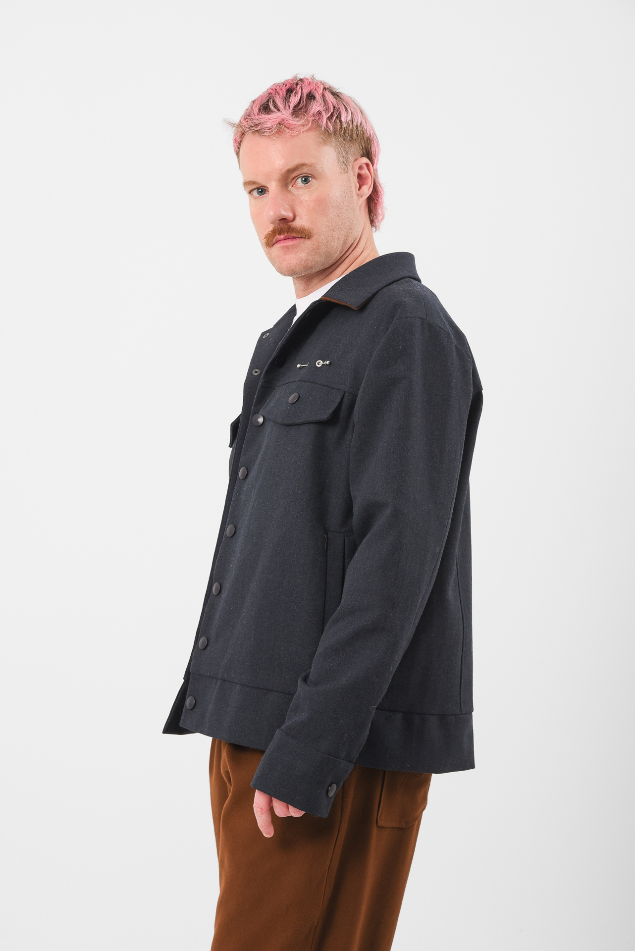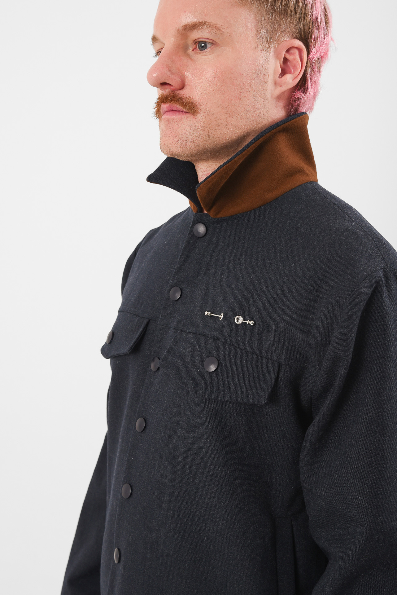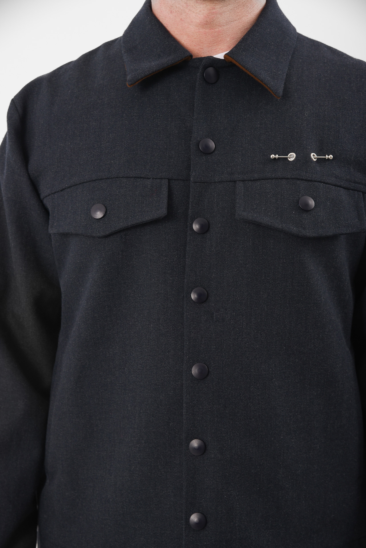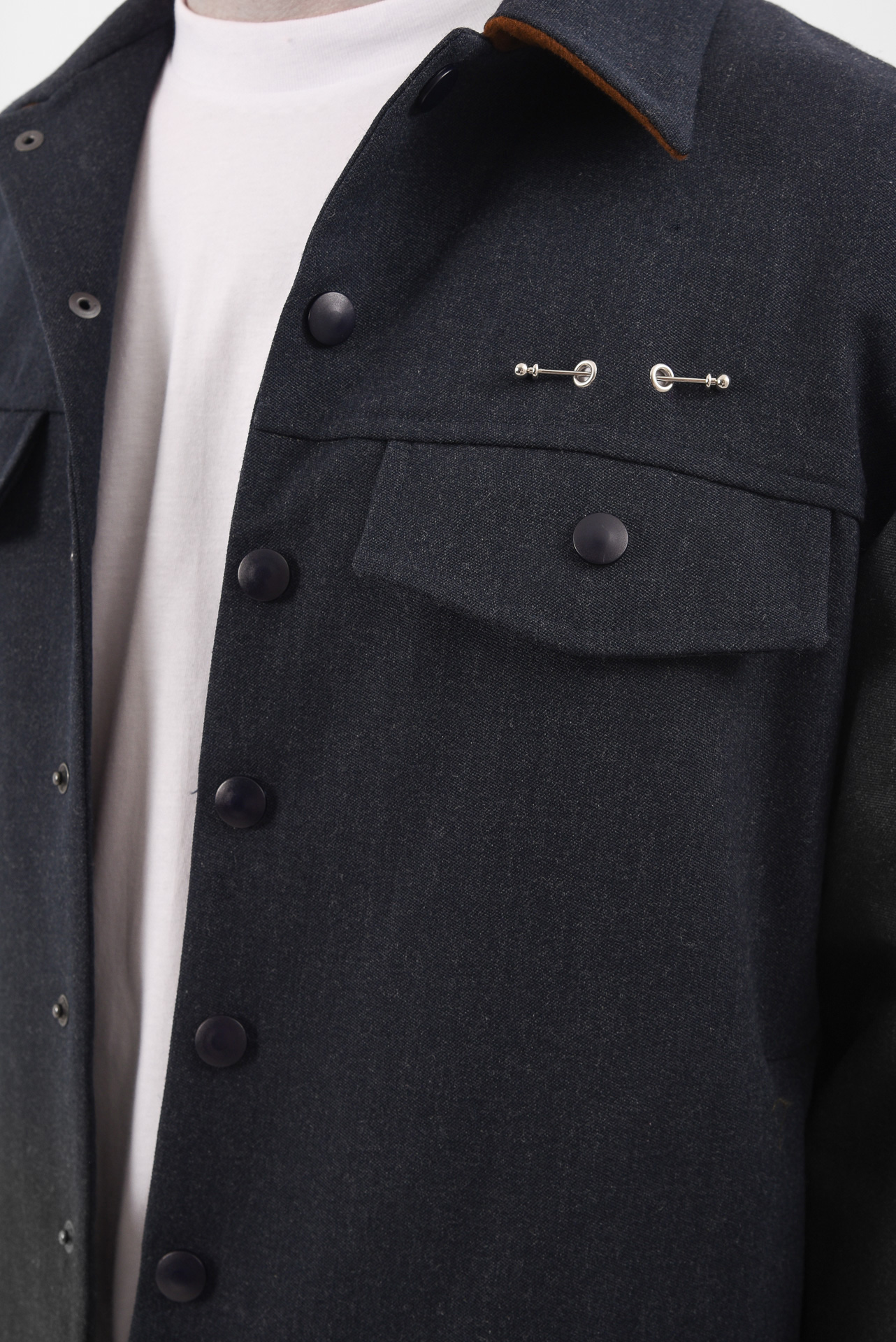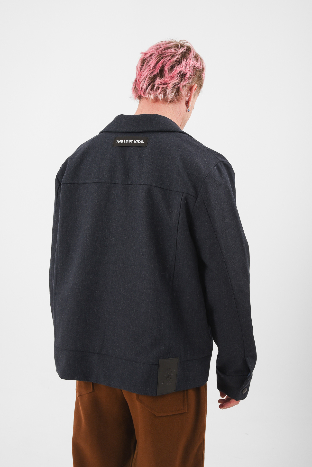 A uniform reprogrammed. The Blue Screen Jacket takes the language of corporate precision and injects it with quiet defiance. Its clean silhouette and sharp tailoring are disrupted by a single piercing detail on the pocket, a subtle act of rebellion against perfection. A soft brown inner collar adds warmth and contrast, a hidden layer of depth beneath composure.
