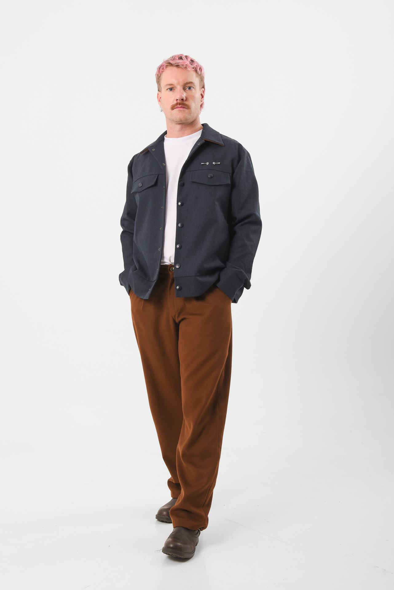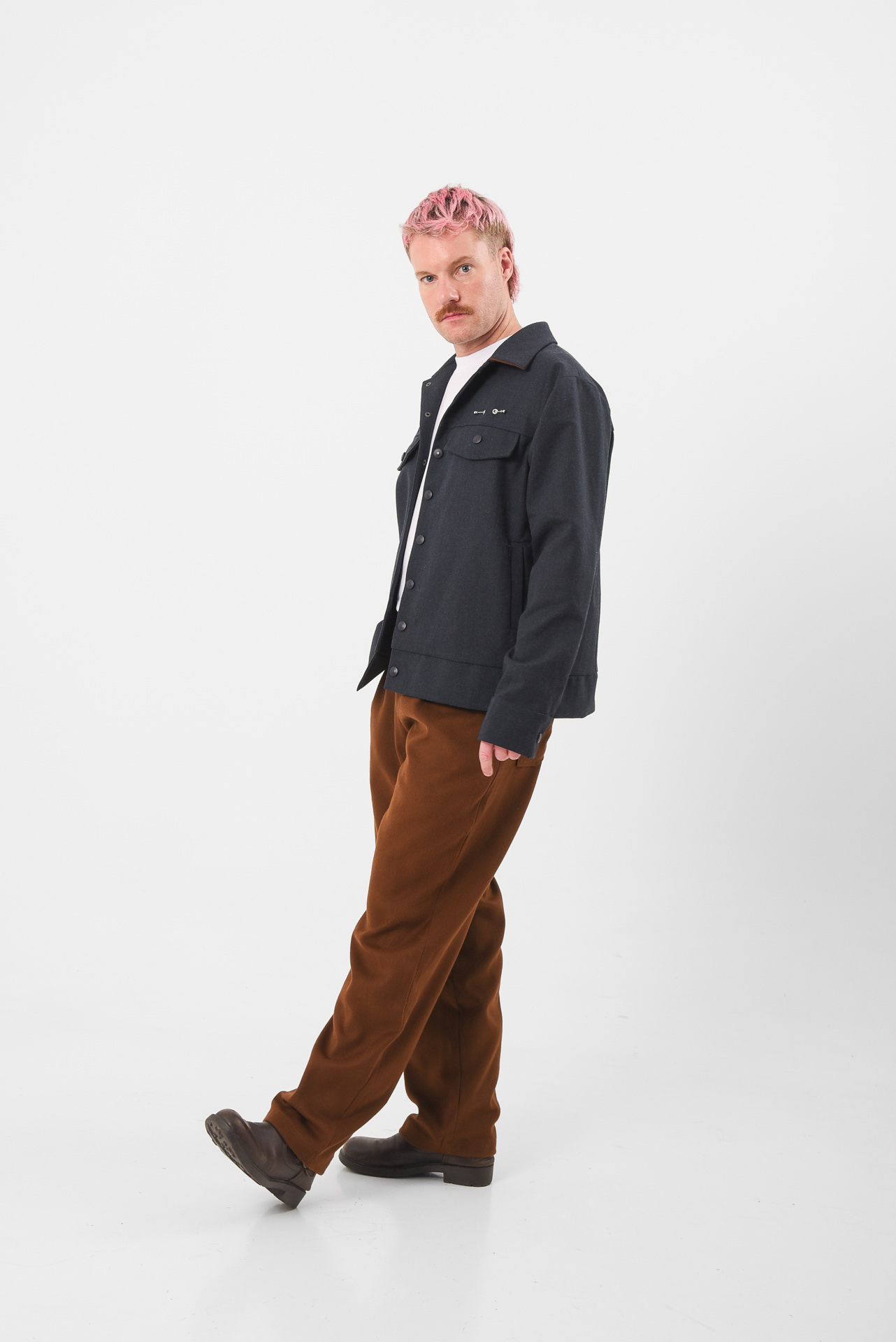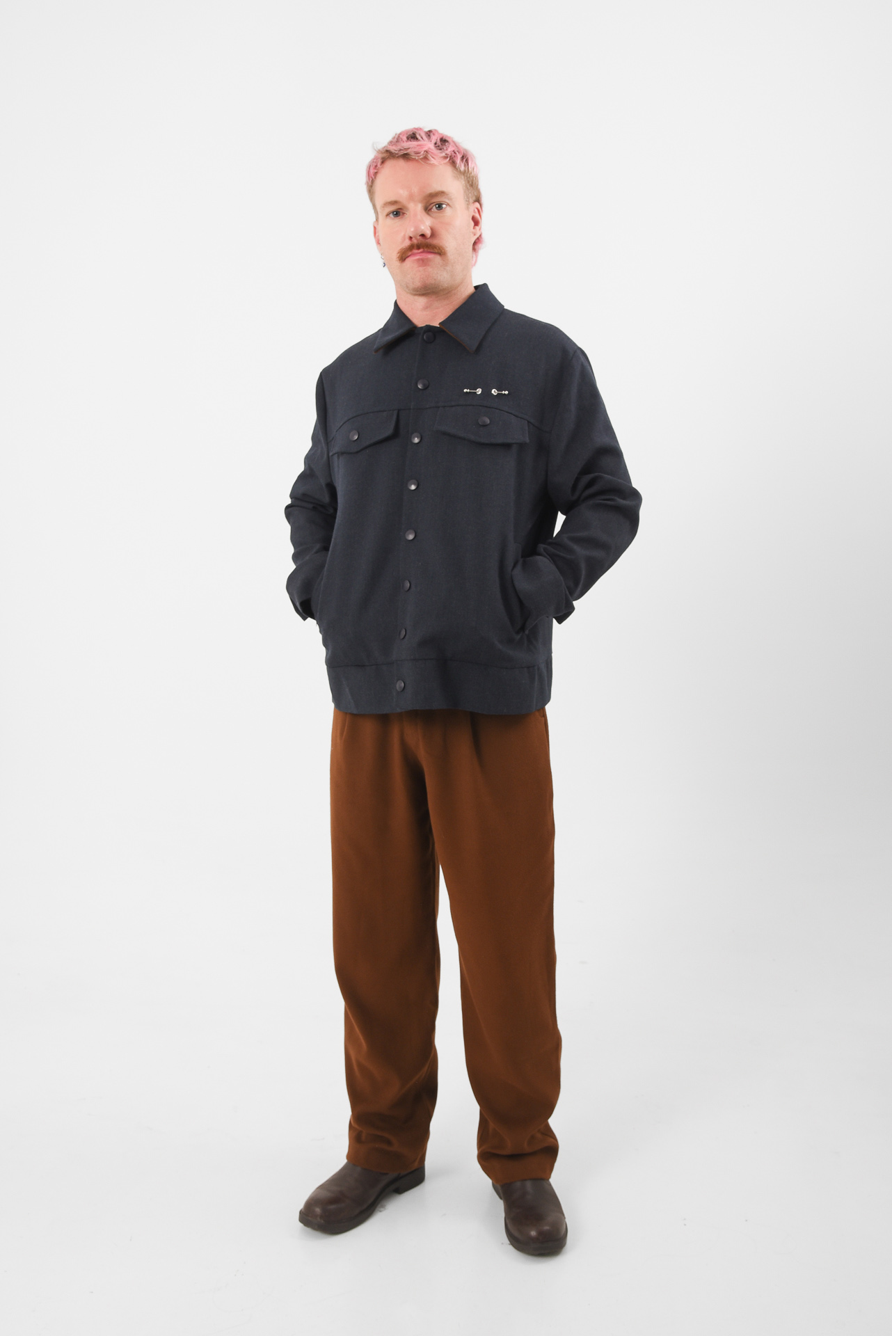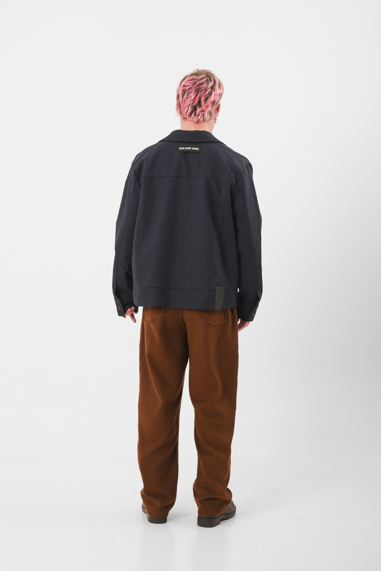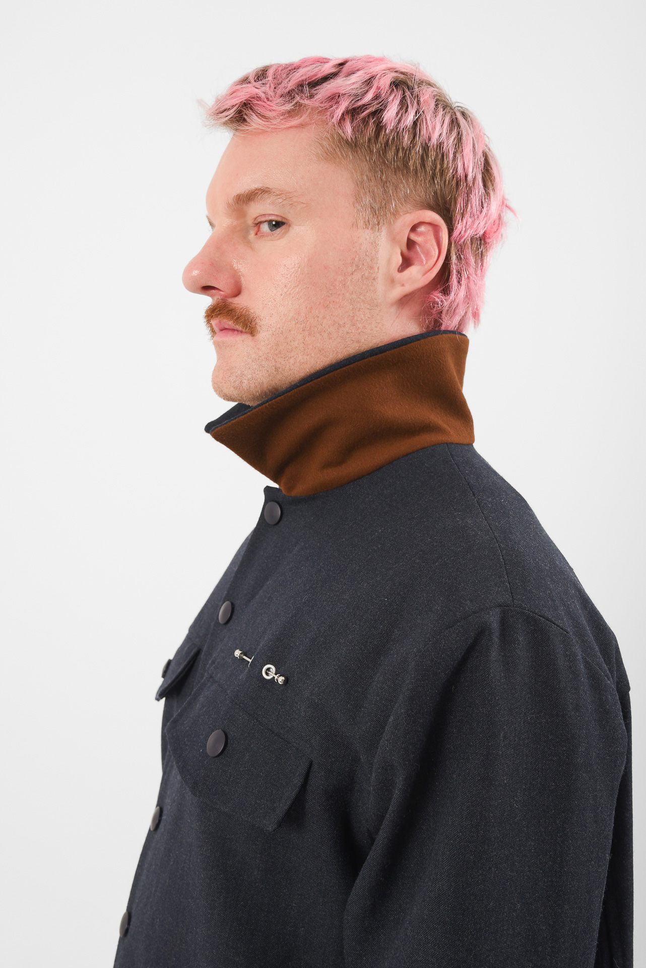 A uniform reprogrammed. The Blue Screen Jacket takes the language of corporate precision and injects it with quiet defiance. Its clean silhouette and sharp tailoring are disrupted by a single piercing detail on the pocket, a subtle act of rebellion against perfection. A soft brown inner collar adds warmth and contrast, a hidden layer of depth beneath composure.