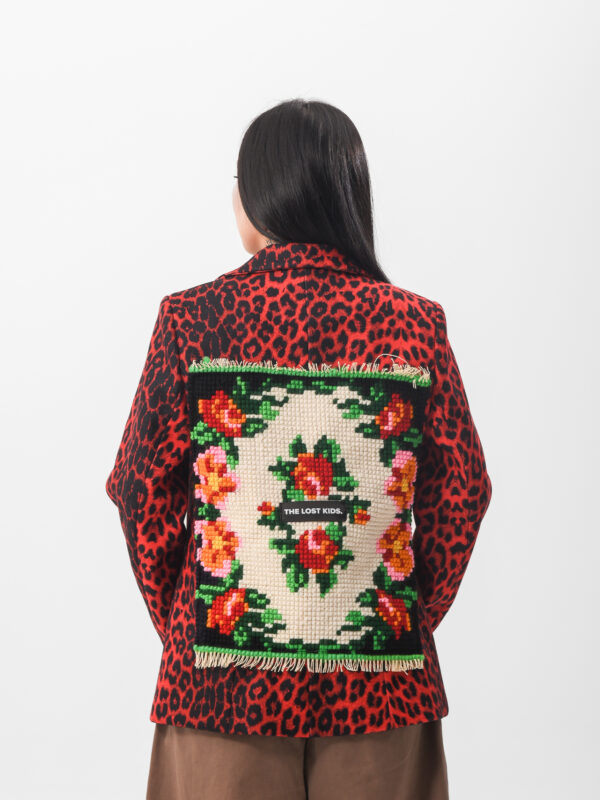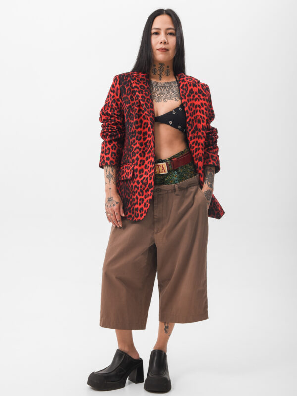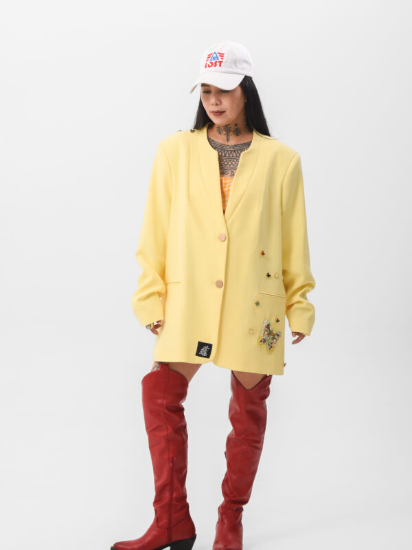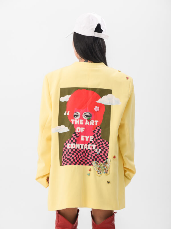 A study in softness and strength. The Bow Suit Jacket is a one-of-a-kind reworked beige jacket, tailored with quiet elegance and adorned with a constellation of small satin bows. Each bow is hand-stitched, transforming the structured silhouette into a field of delicate gestures, where formality meets whimsy.