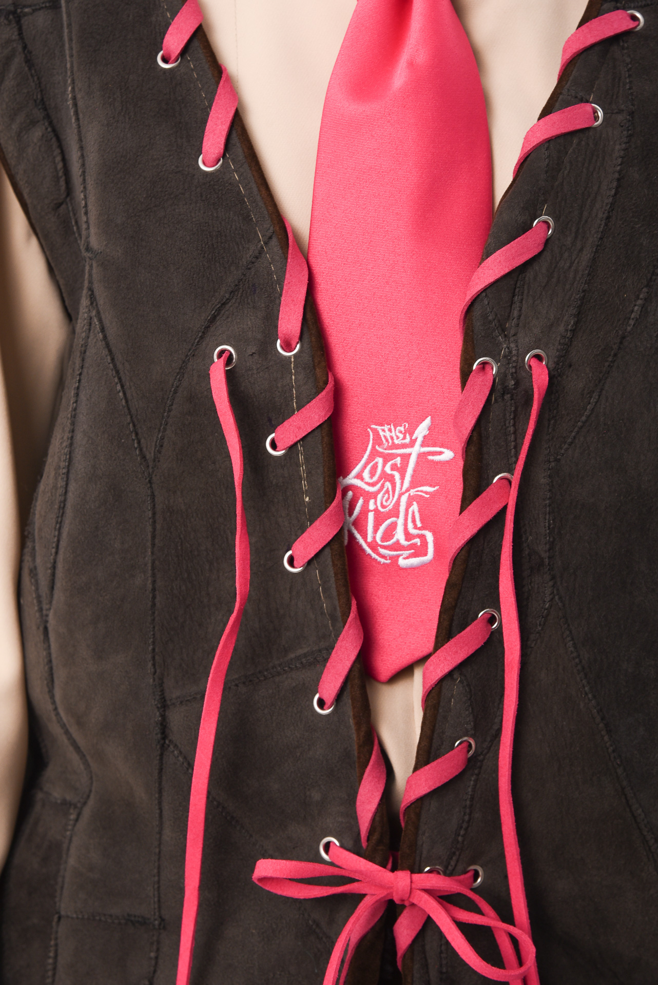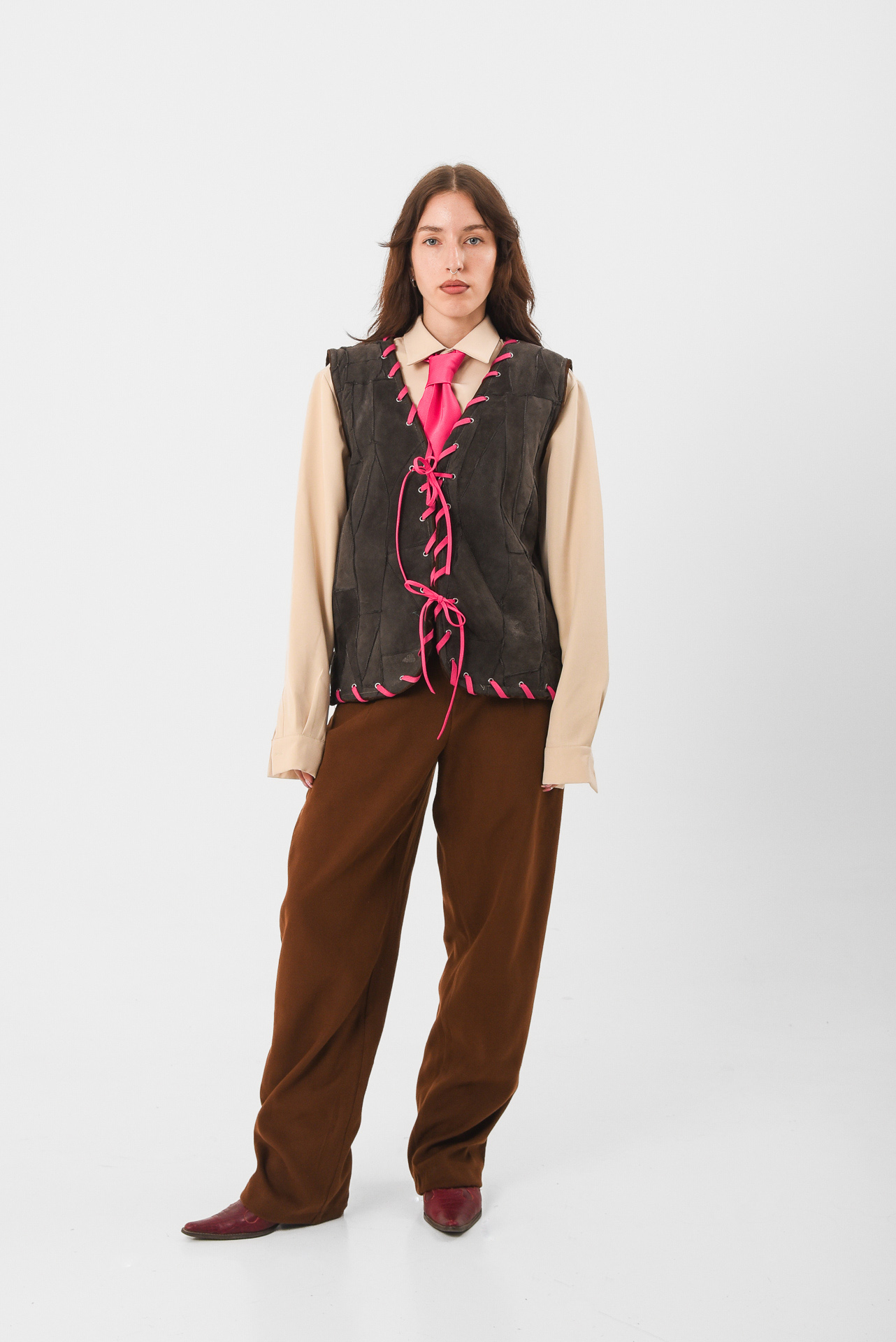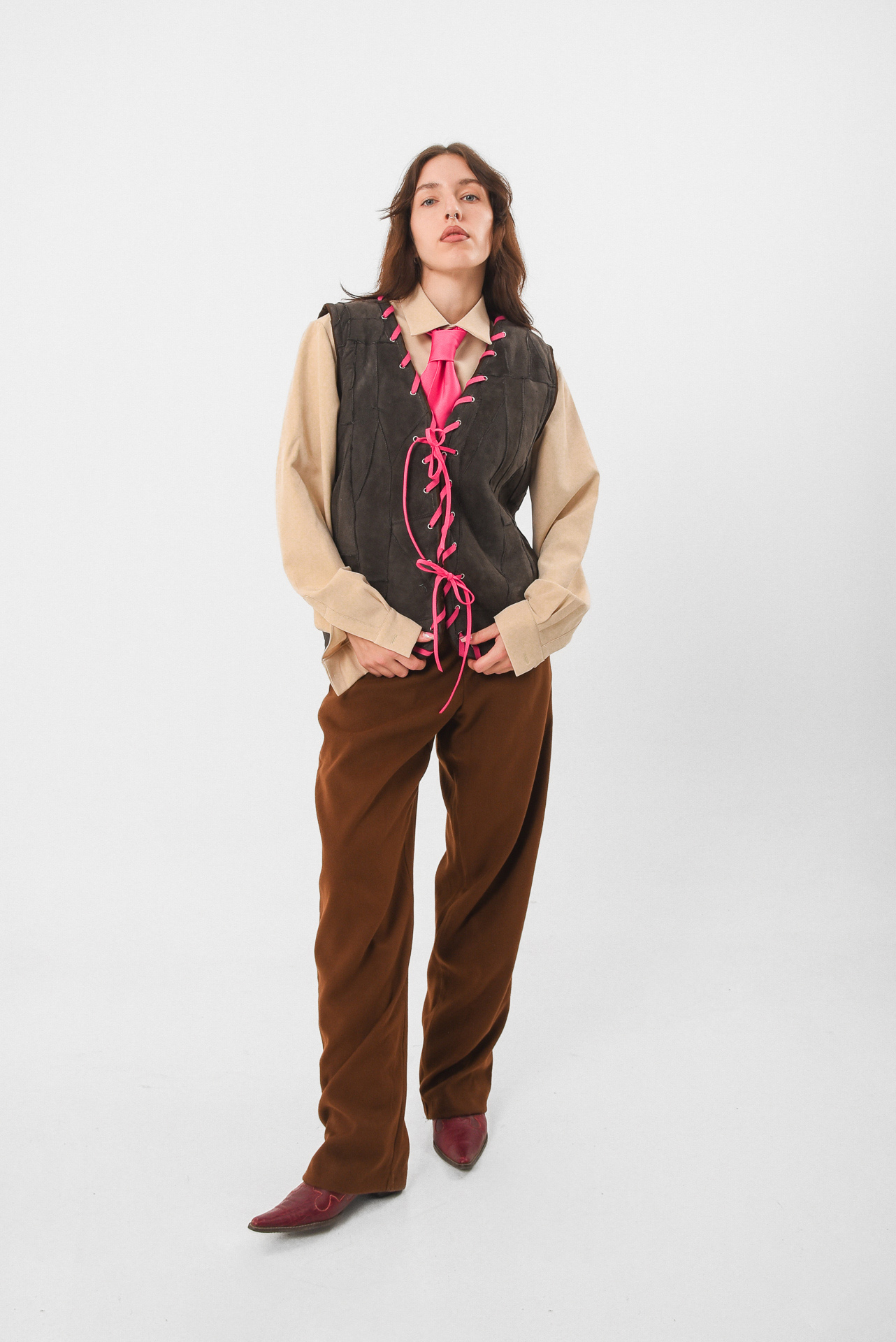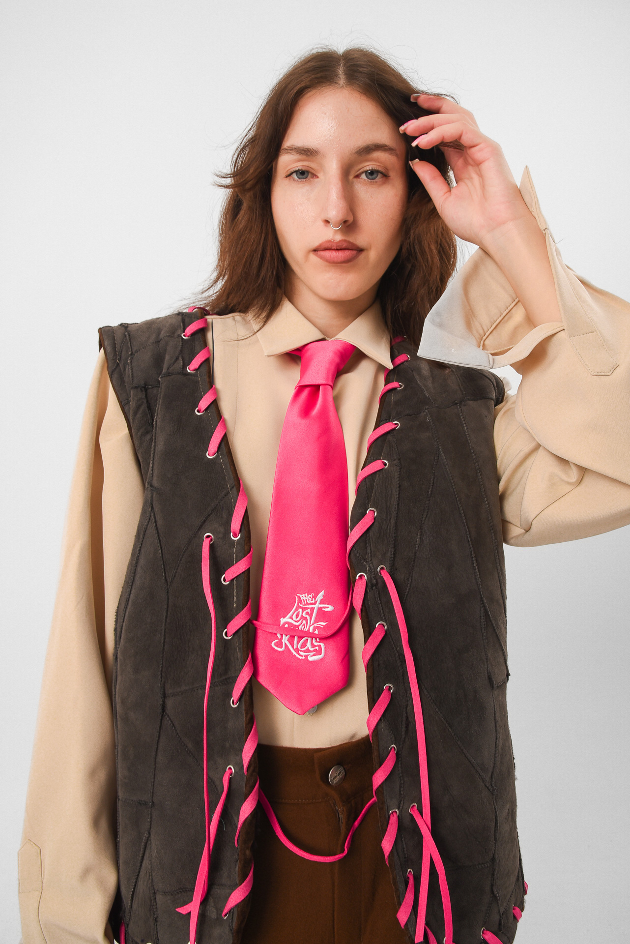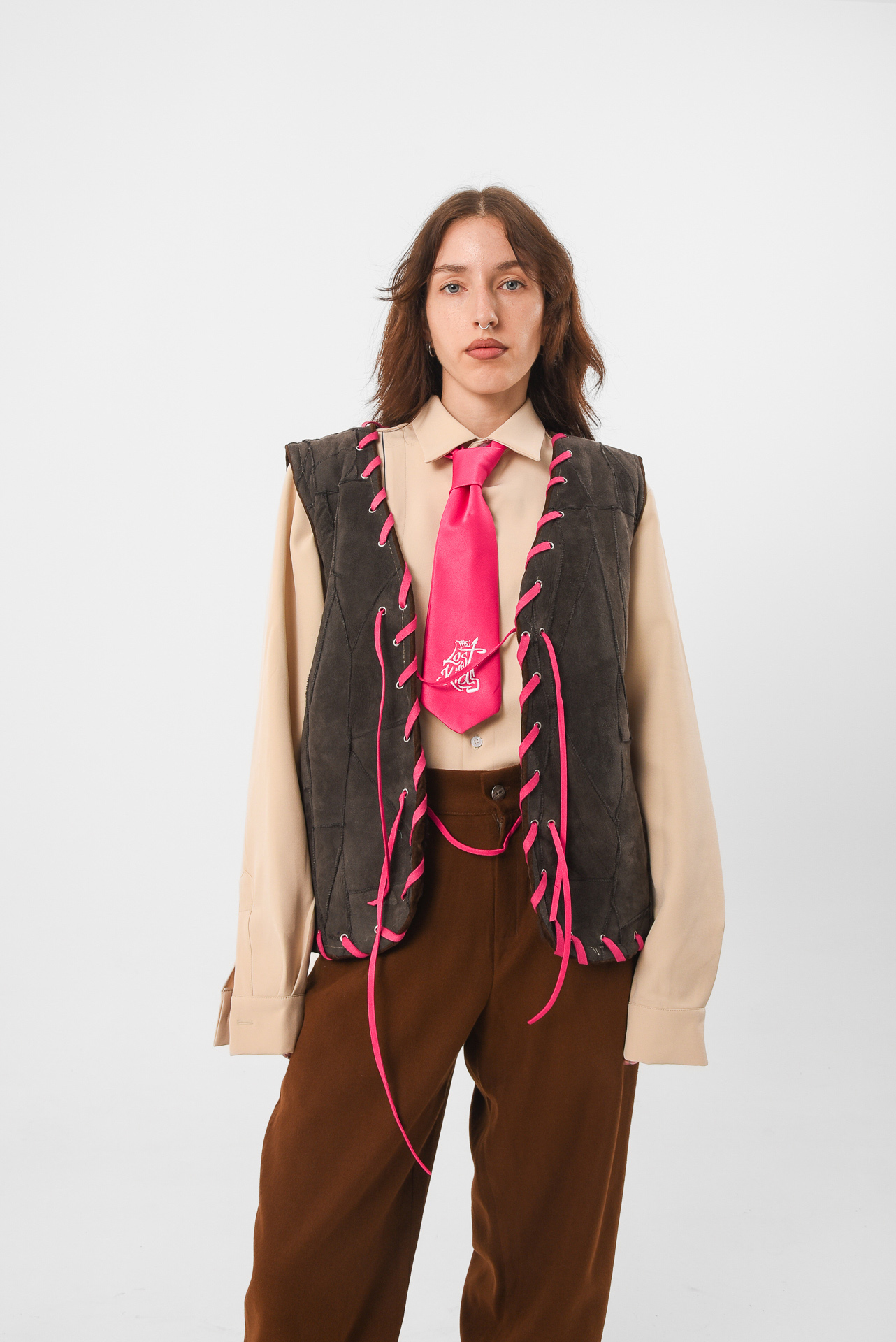 For the wild hearts and soft rebels. The Maverick Vest reimagines the cowgirl classic,a brown Western vest lined with cozy synthetic fur and finished with bold fuchsia string details. On the back, a large heart-shaped embroidery patch depicts a Crybaby Angel, blending tenderness with defiance.