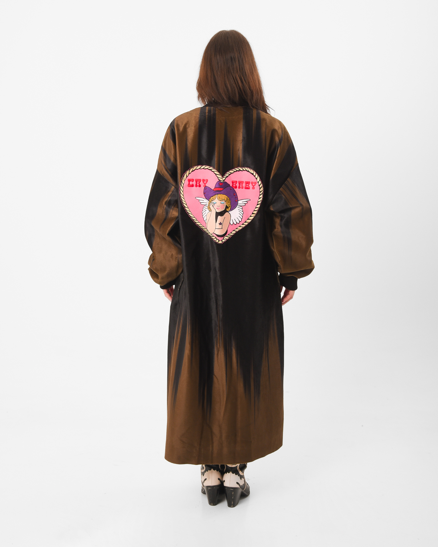 Tough hide, tender heart, crafted from suede-like, horsy-textured fabric that nods to Western grit, but stitched with softness at its core. On the back, a personalized heart patch frames a tiny crybaby angel, a symbol for the outlaws who feel deeply, love loudly, and ride their own way.