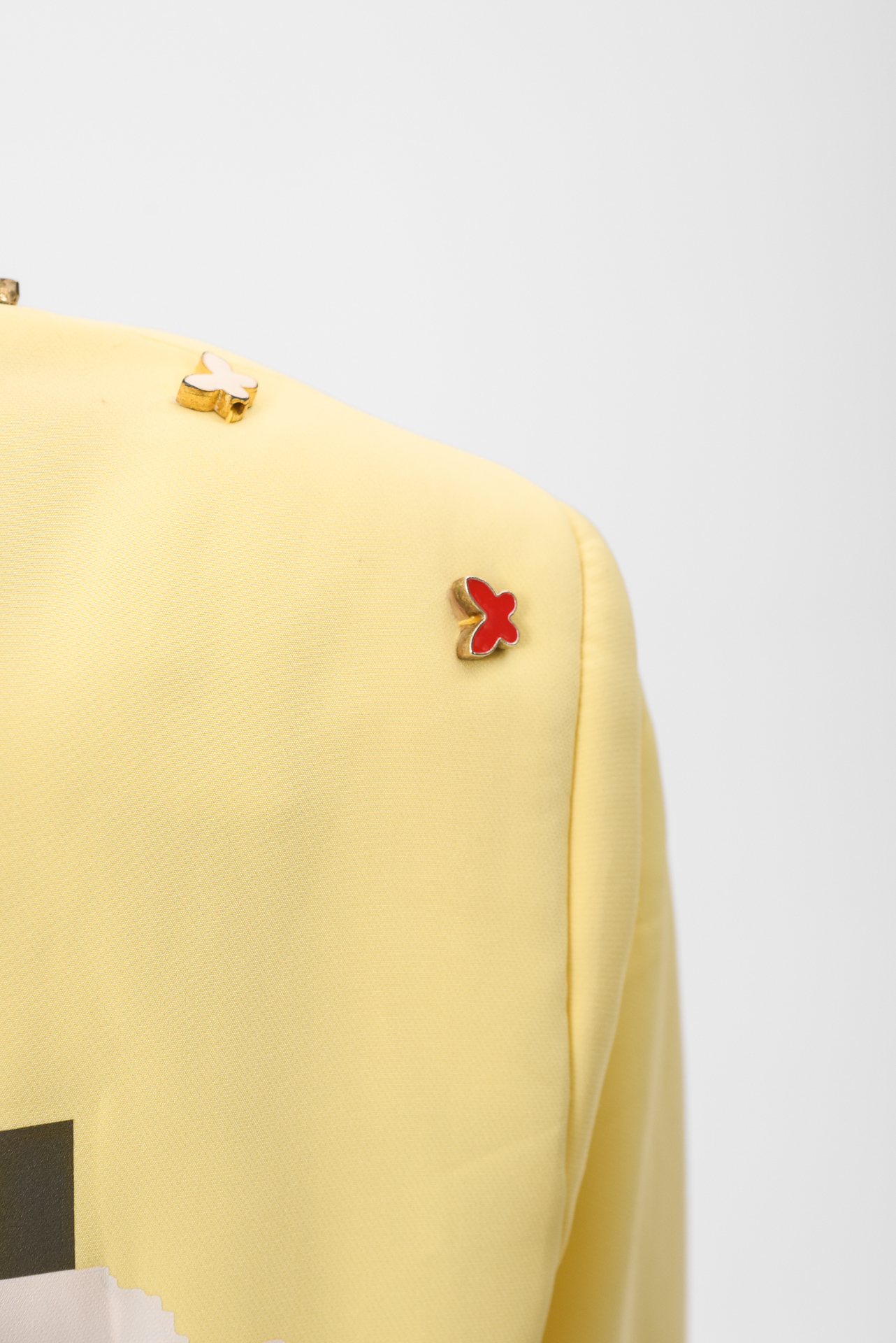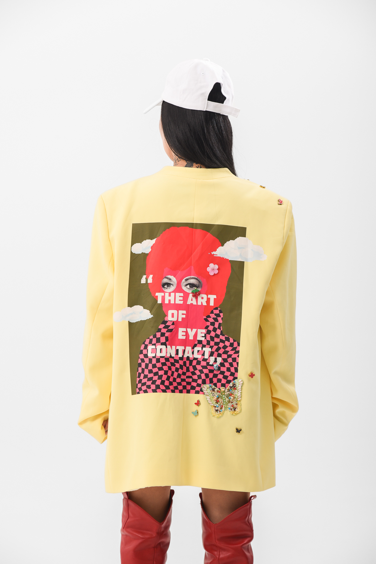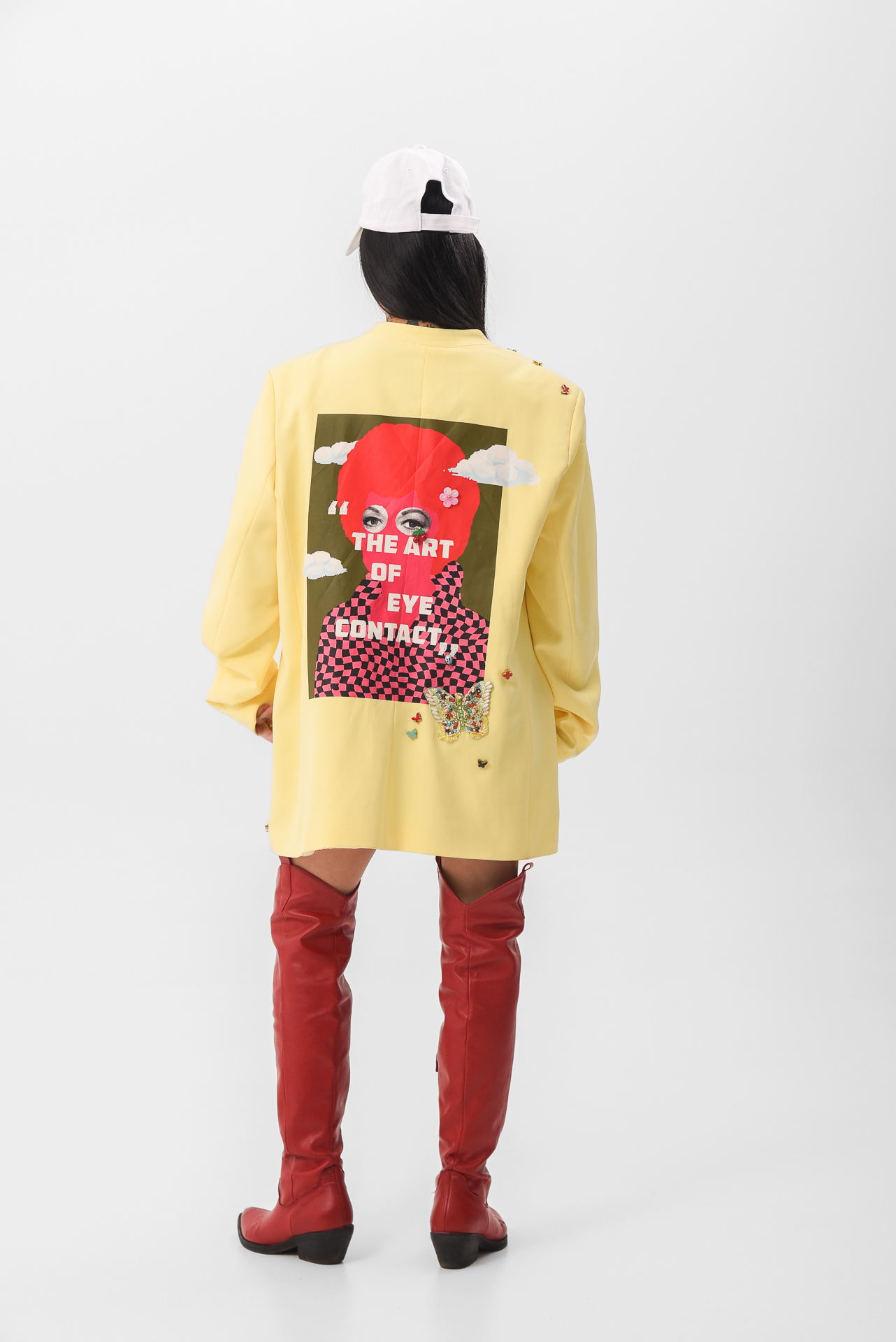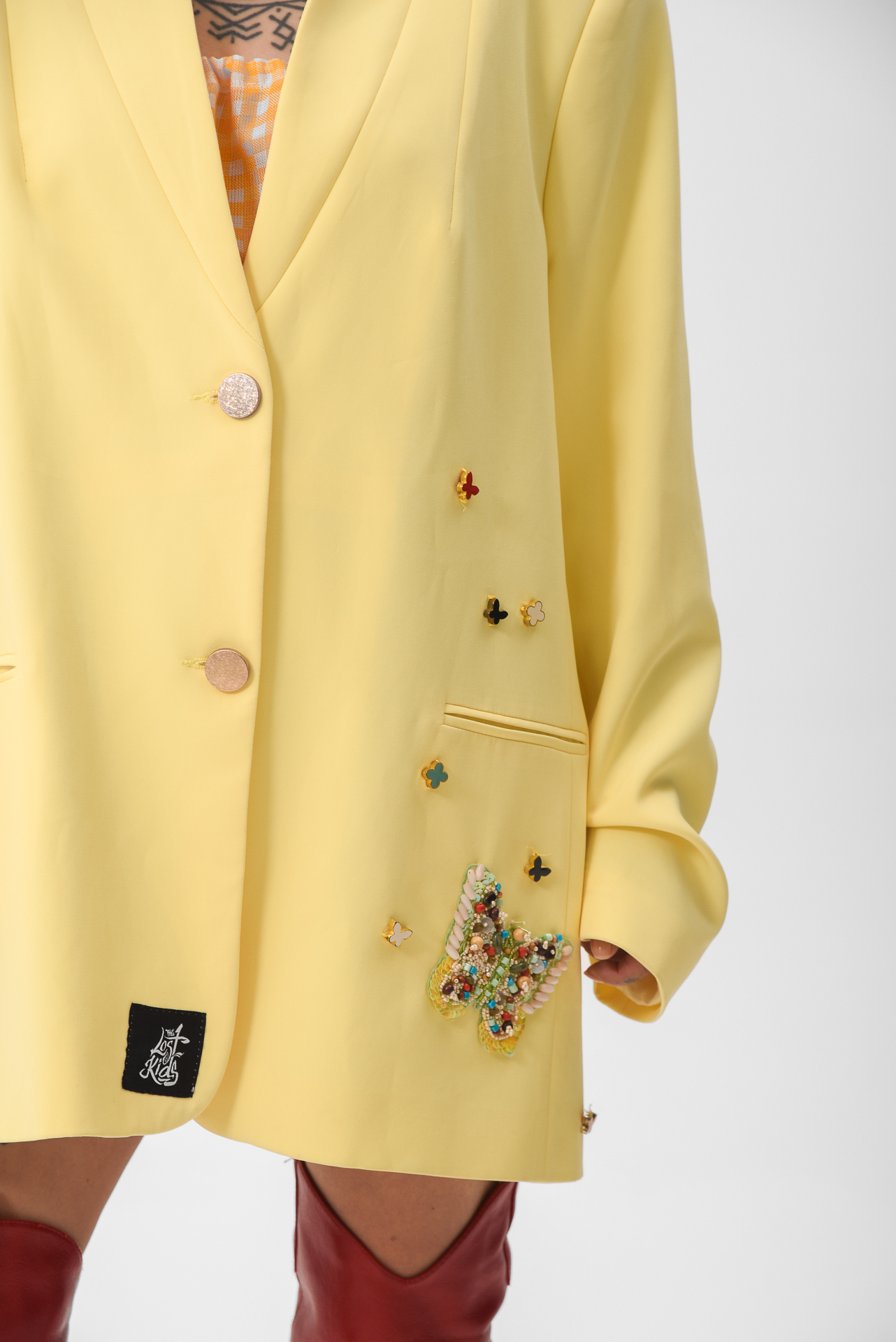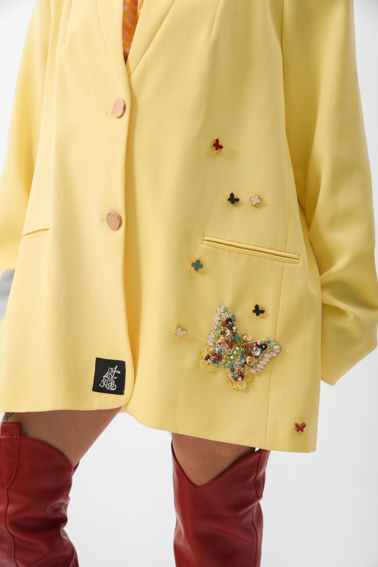 The Softly in bloom Jacket is a yellow statement piece layered with embroidered details, stitched appliqués, and delicate butterfly accents. Maximal in texture, yet calm in feeling, like sunlight filtered through movement.