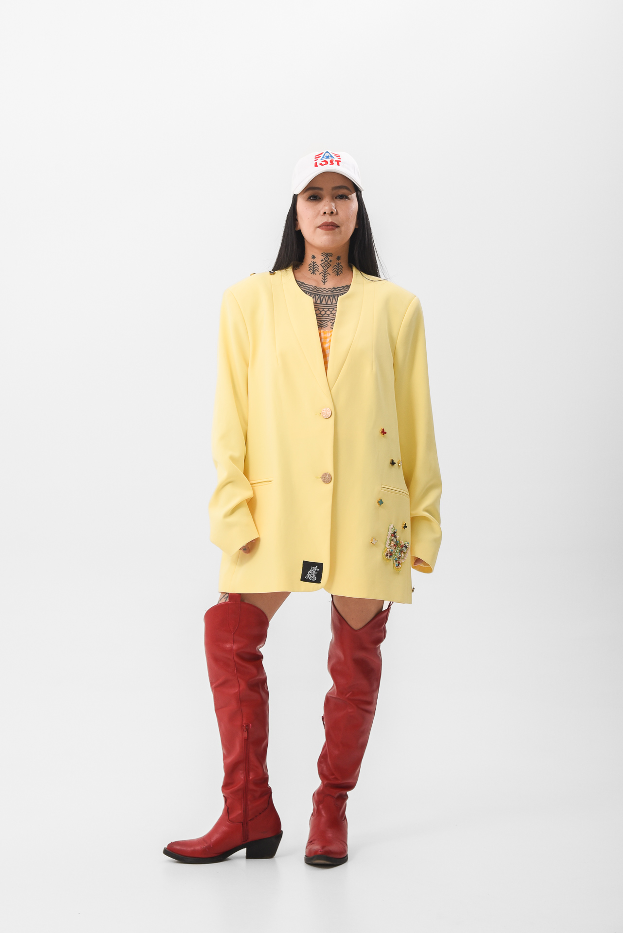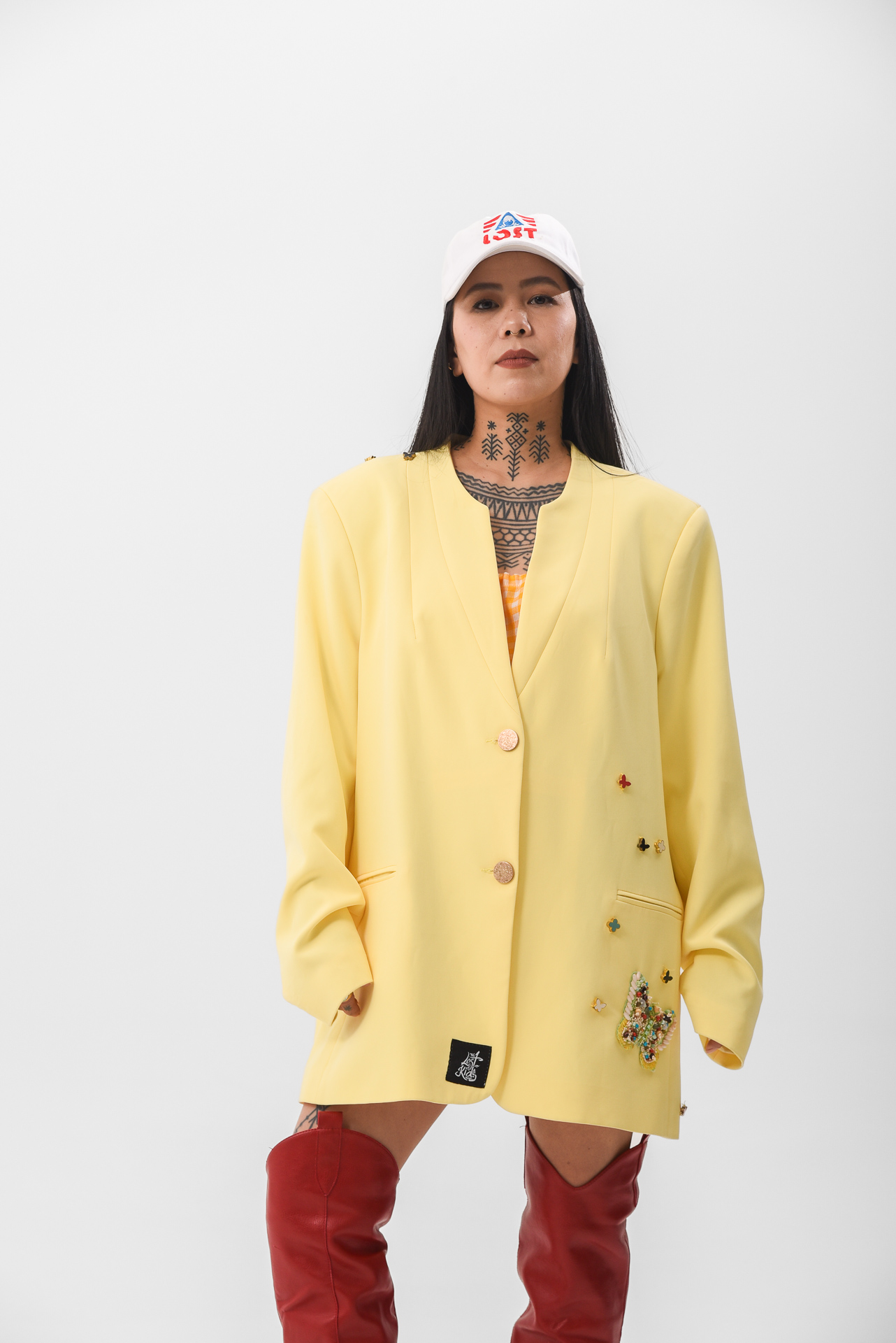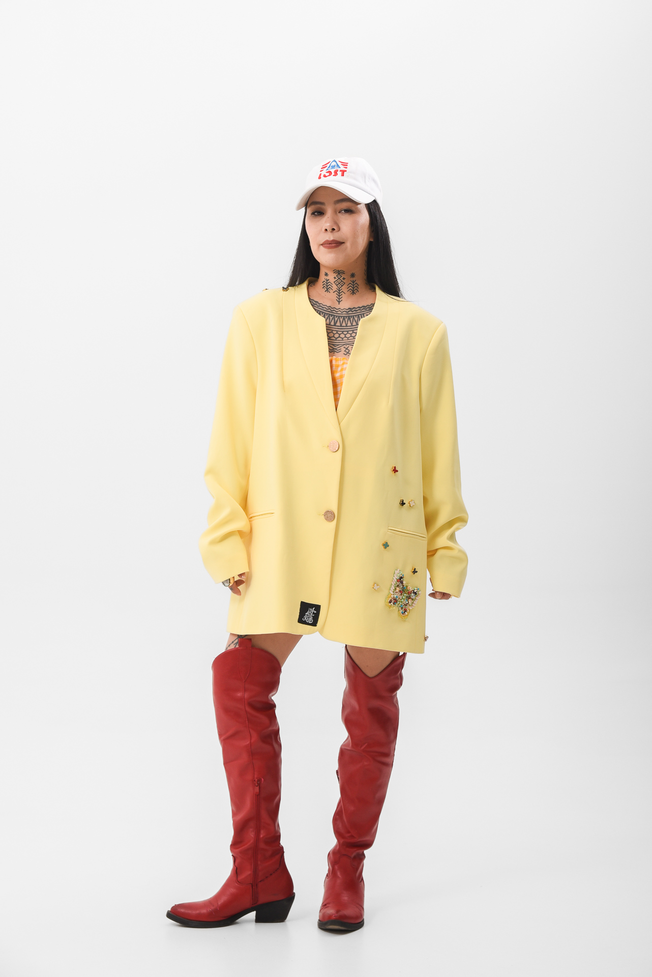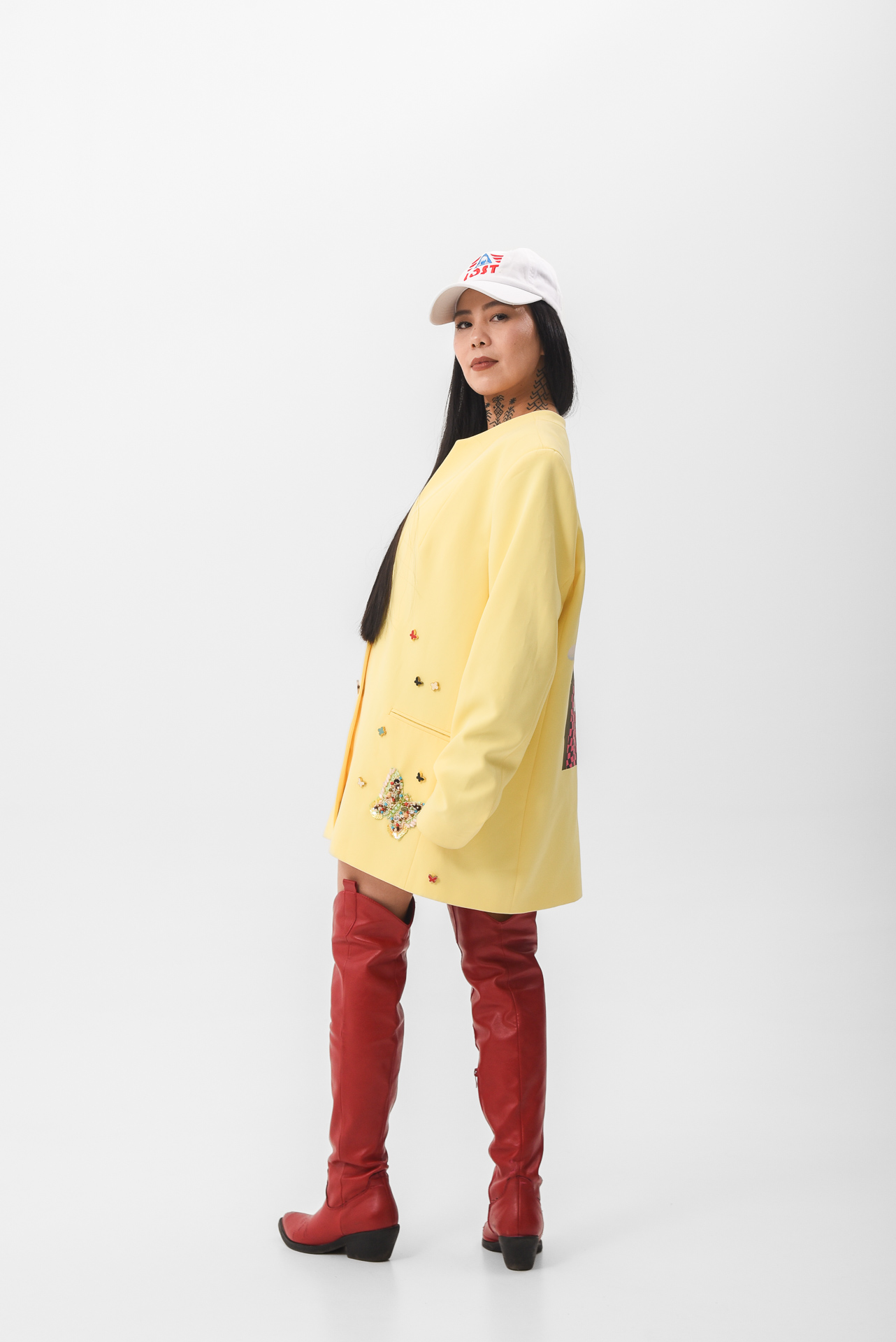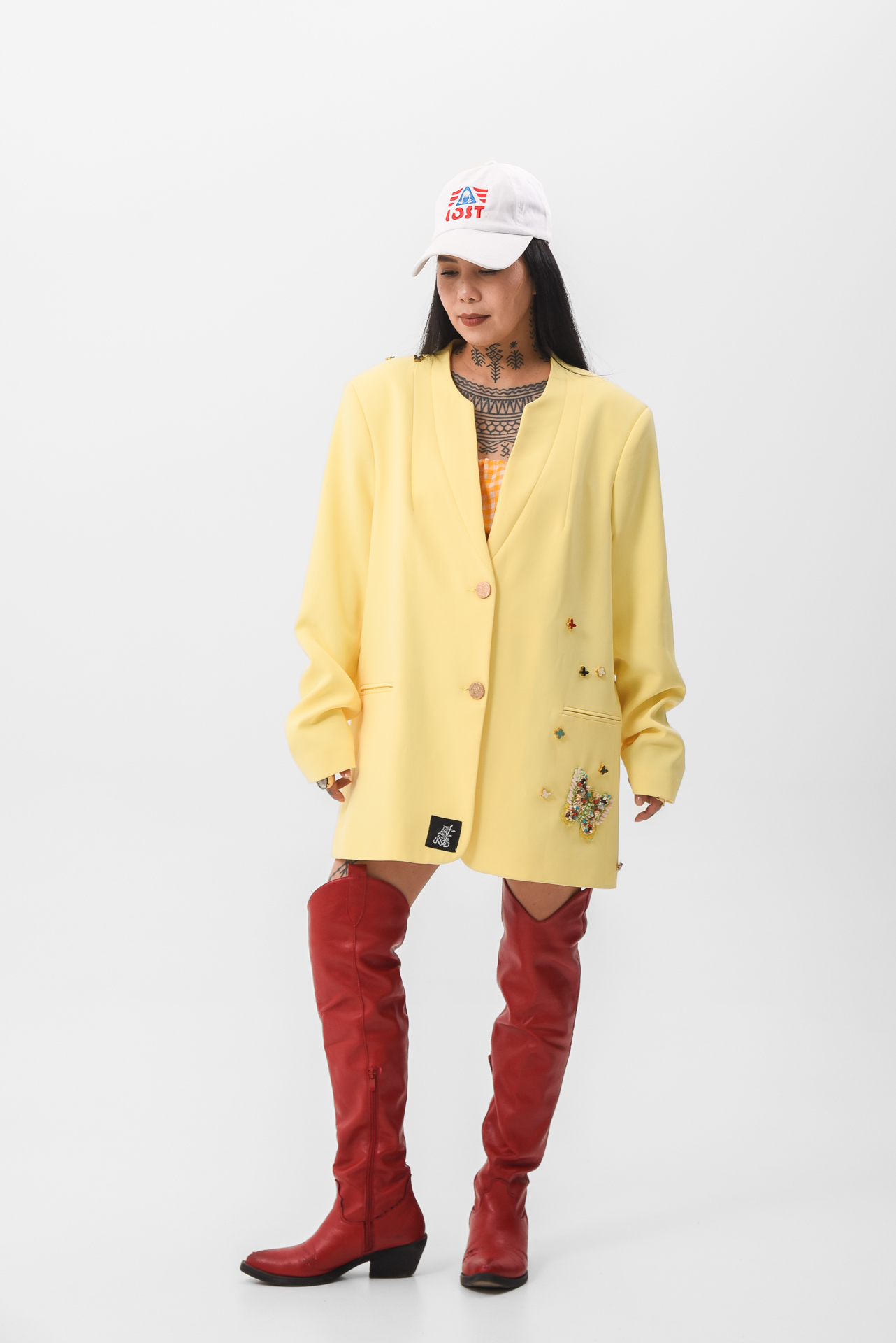 The Softly in bloom Jacket is a yellow statement piece layered with embroidered details, stitched appliqués, and delicate butterfly accents. Maximal in texture, yet calm in feeling, like sunlight filtered through movement.