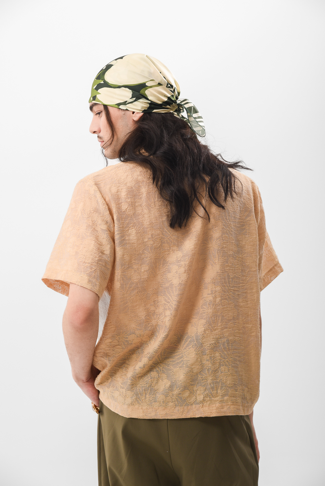 The Dream Shirt is a loose-fit piece in semi-sheer, linen-feel fabric, embroidered with delicate patterns that echo handmade textiles,something between a curtain, a tablecloth, and a summer afternoon.