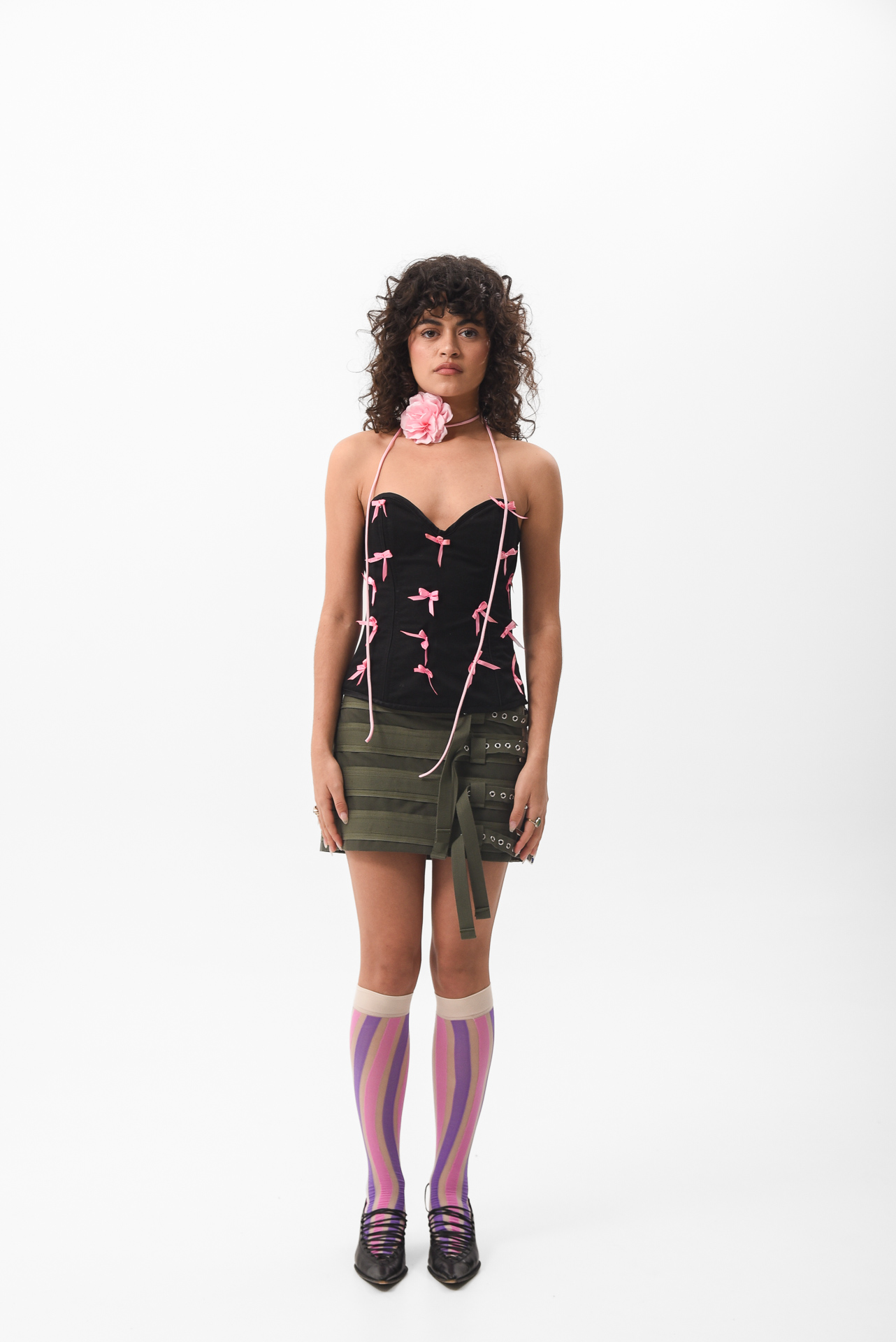 The Belted Muse Skirt reworks army references into something unapologetically sensual, layered with metallic belt details, hanging strings, and a silhouette that moves between structure and exposure.