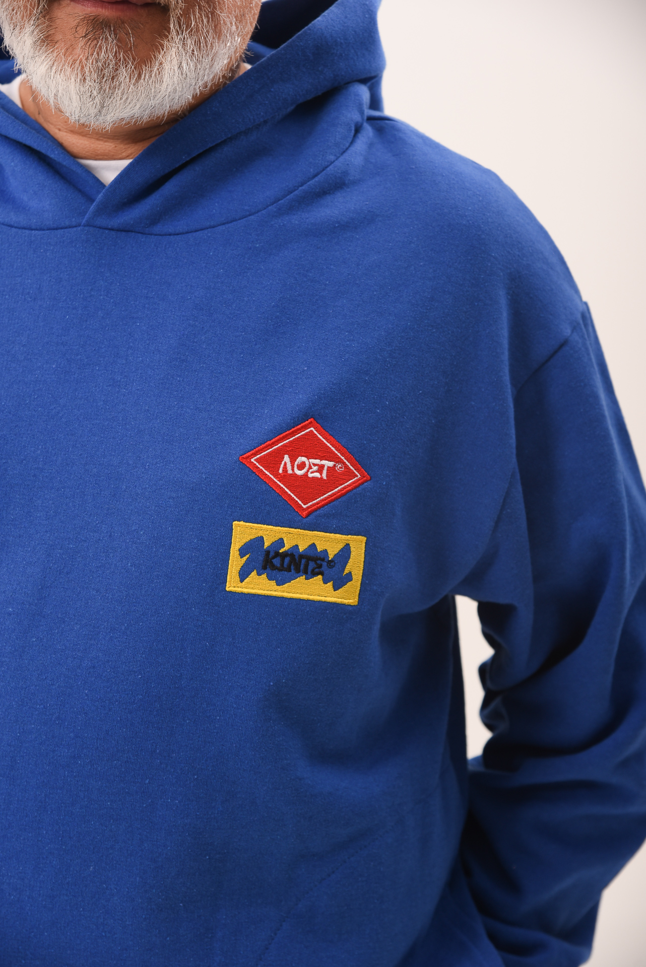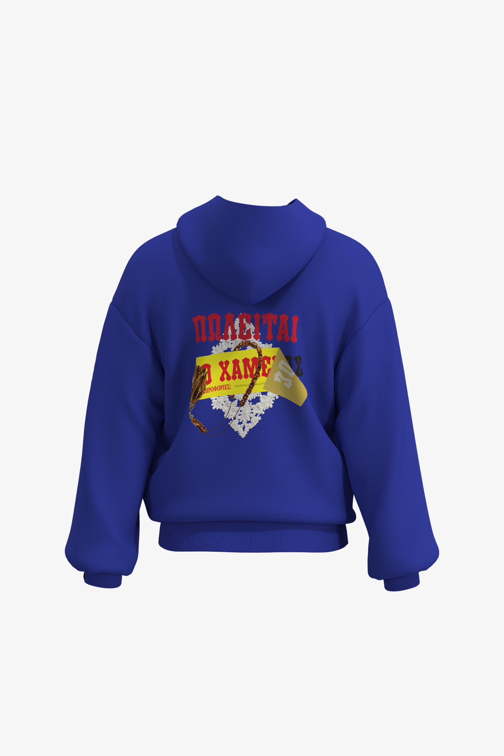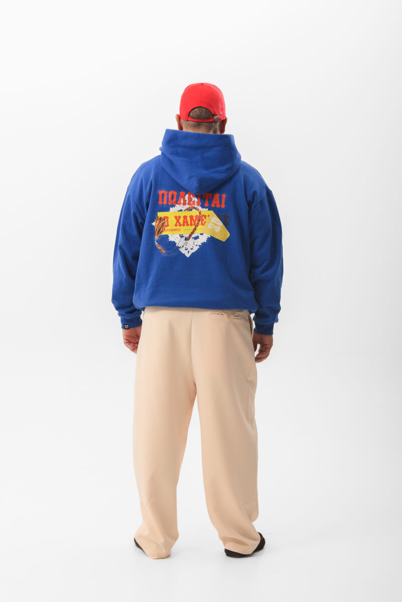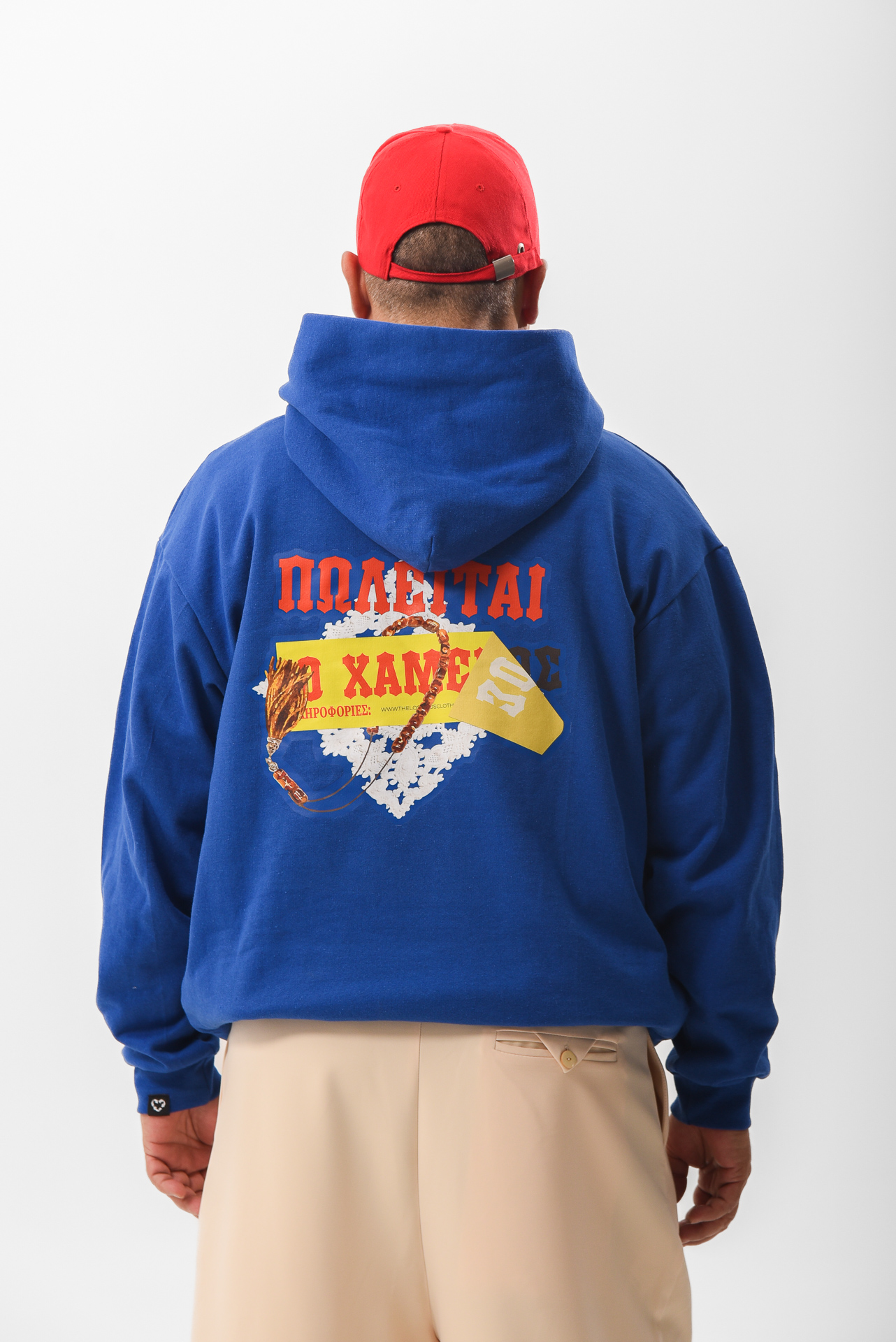 The ΠΩΛΕΙΤΑΙ Ο ΧΑΜΕΝΟΣ Hoodie is a recycled blue piece that carries fragments of everyday Greek and Balkan life, a yiayia’s doily, a komboloi, distinctive greek for sale street posters, and quiet symbols of a culture that’s both lived and performed.