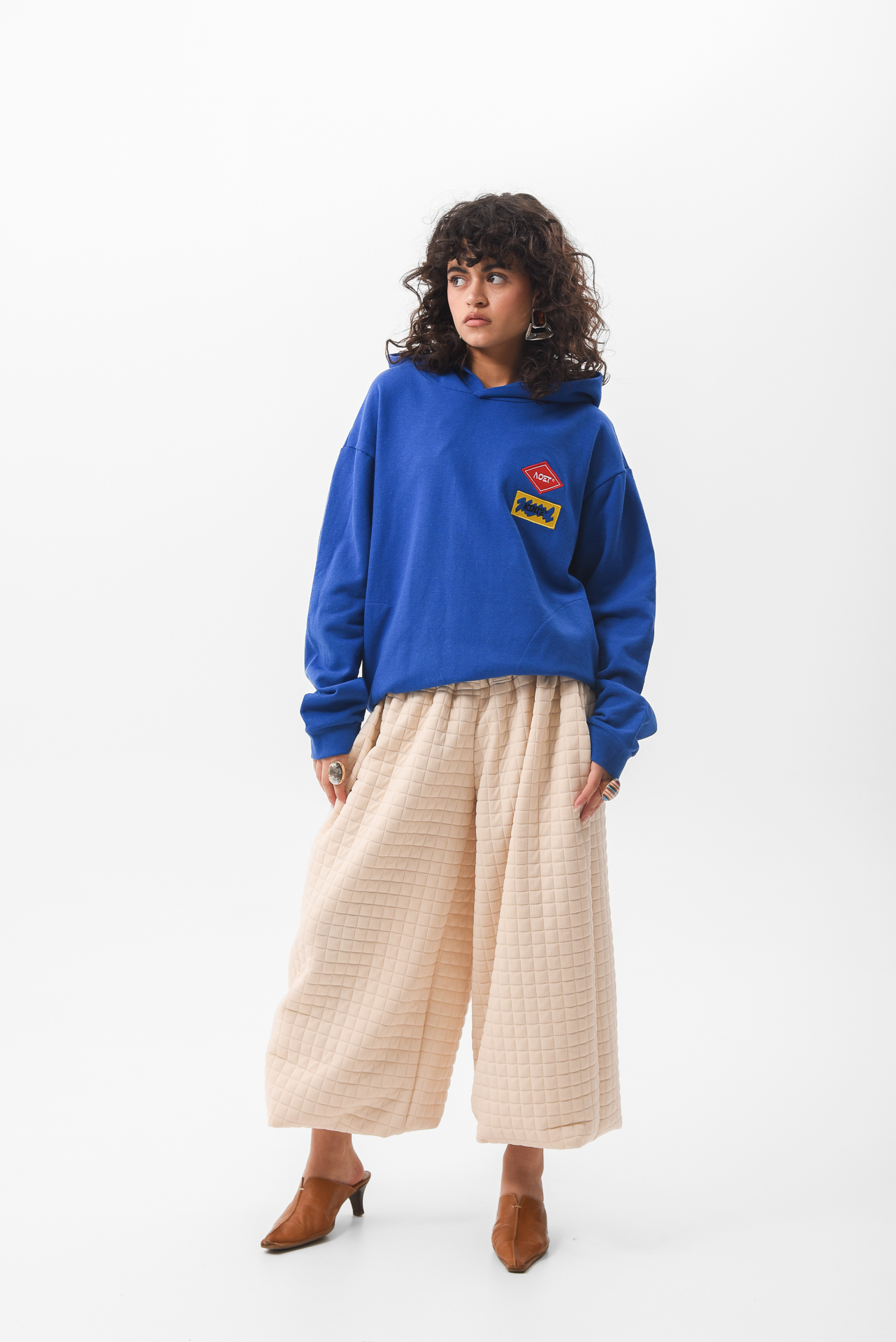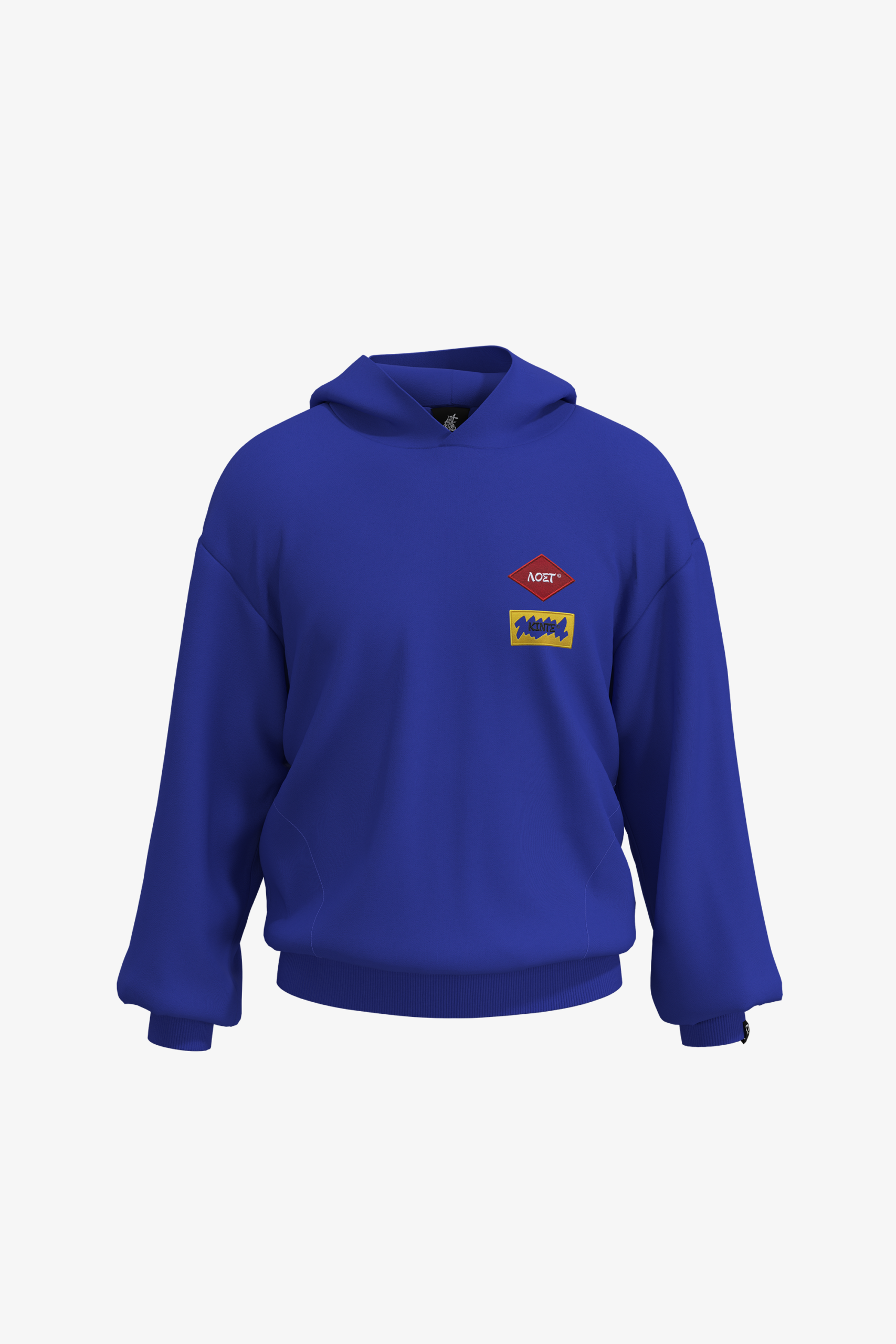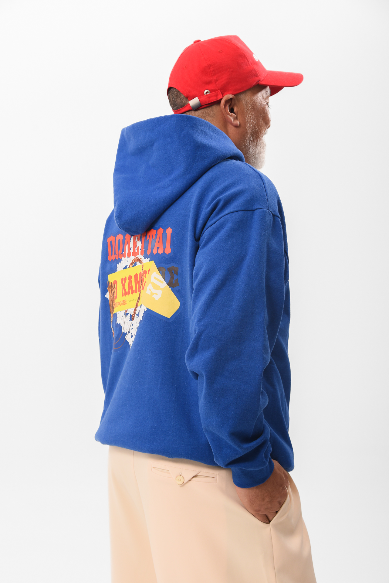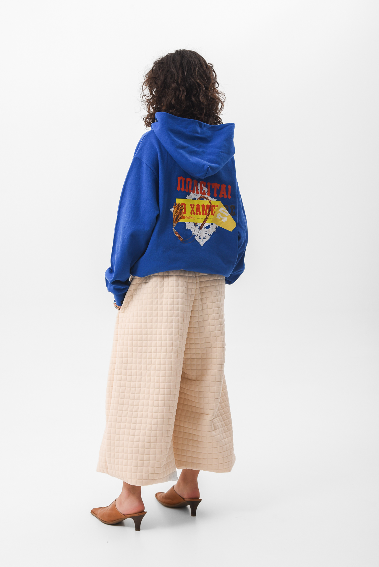 The ΠΩΛΕΙΤΑΙ Ο ΧΑΜΕΝΟΣ Hoodie is a recycled blue piece that carries fragments of everyday Greek and Balkan life, a yiayia’s doily, a komboloi, distinctive greek for sale street posters, and quiet symbols of a culture that’s both lived and performed.