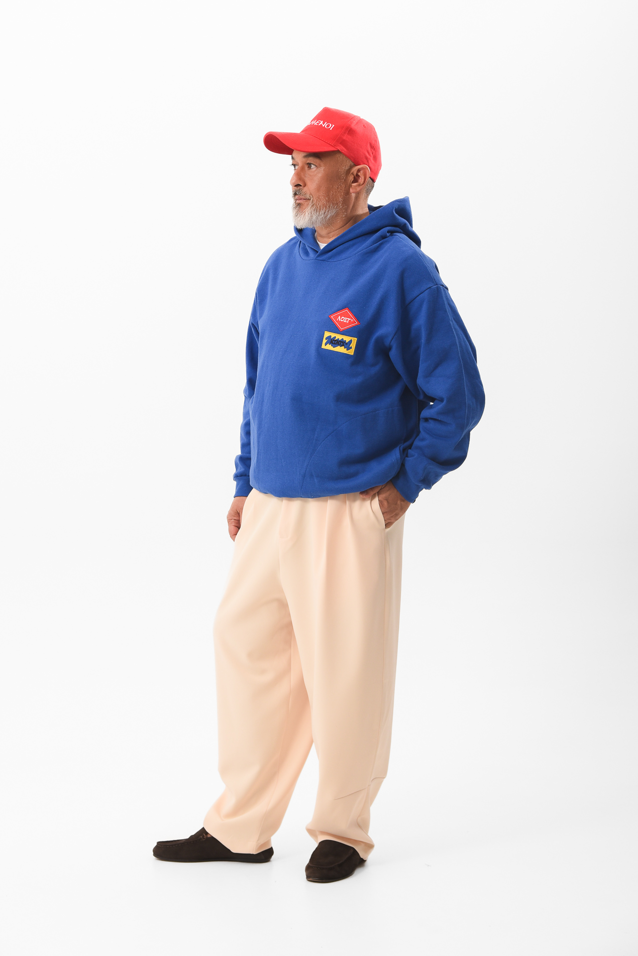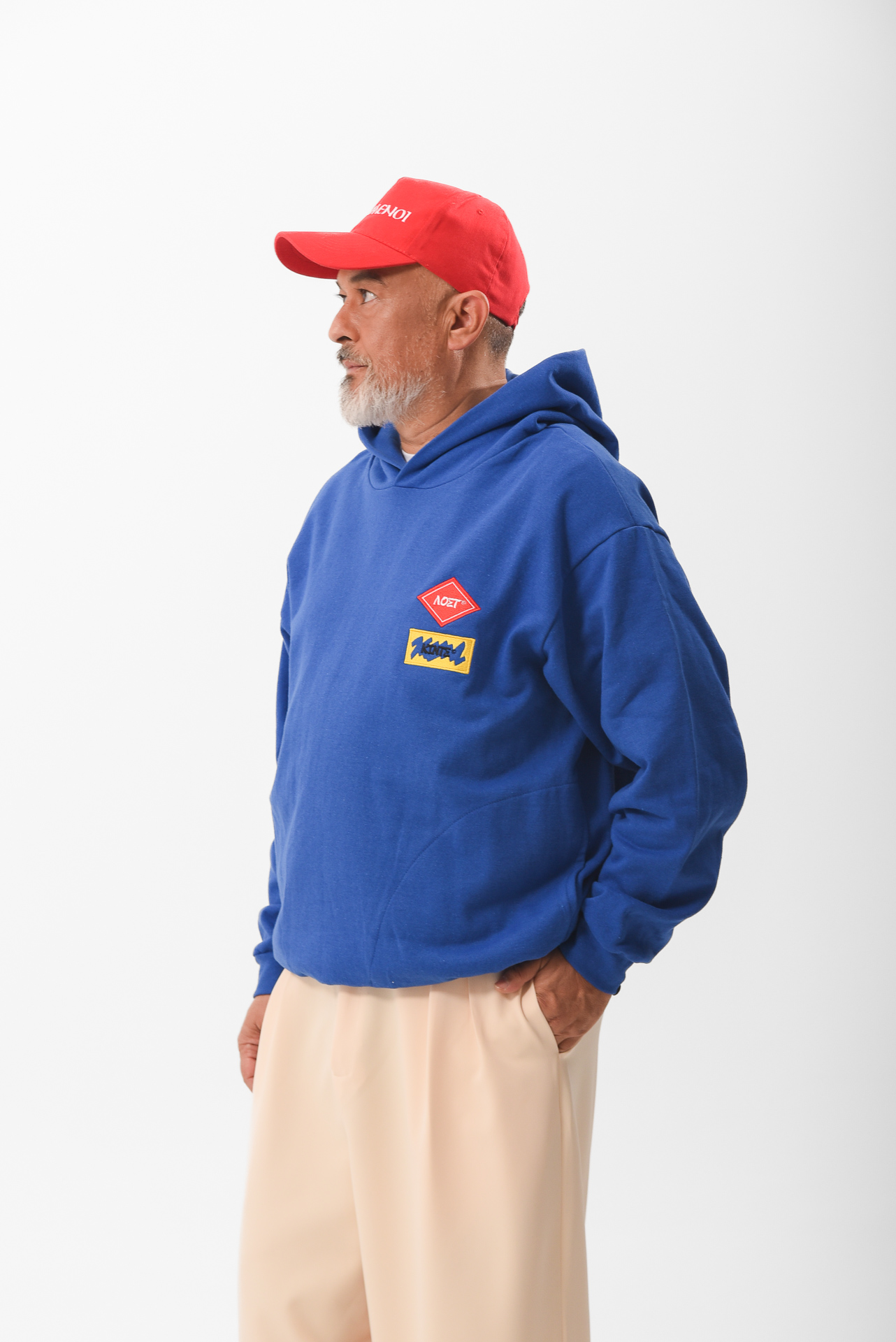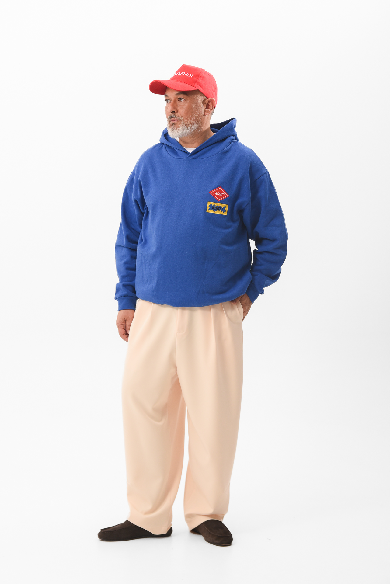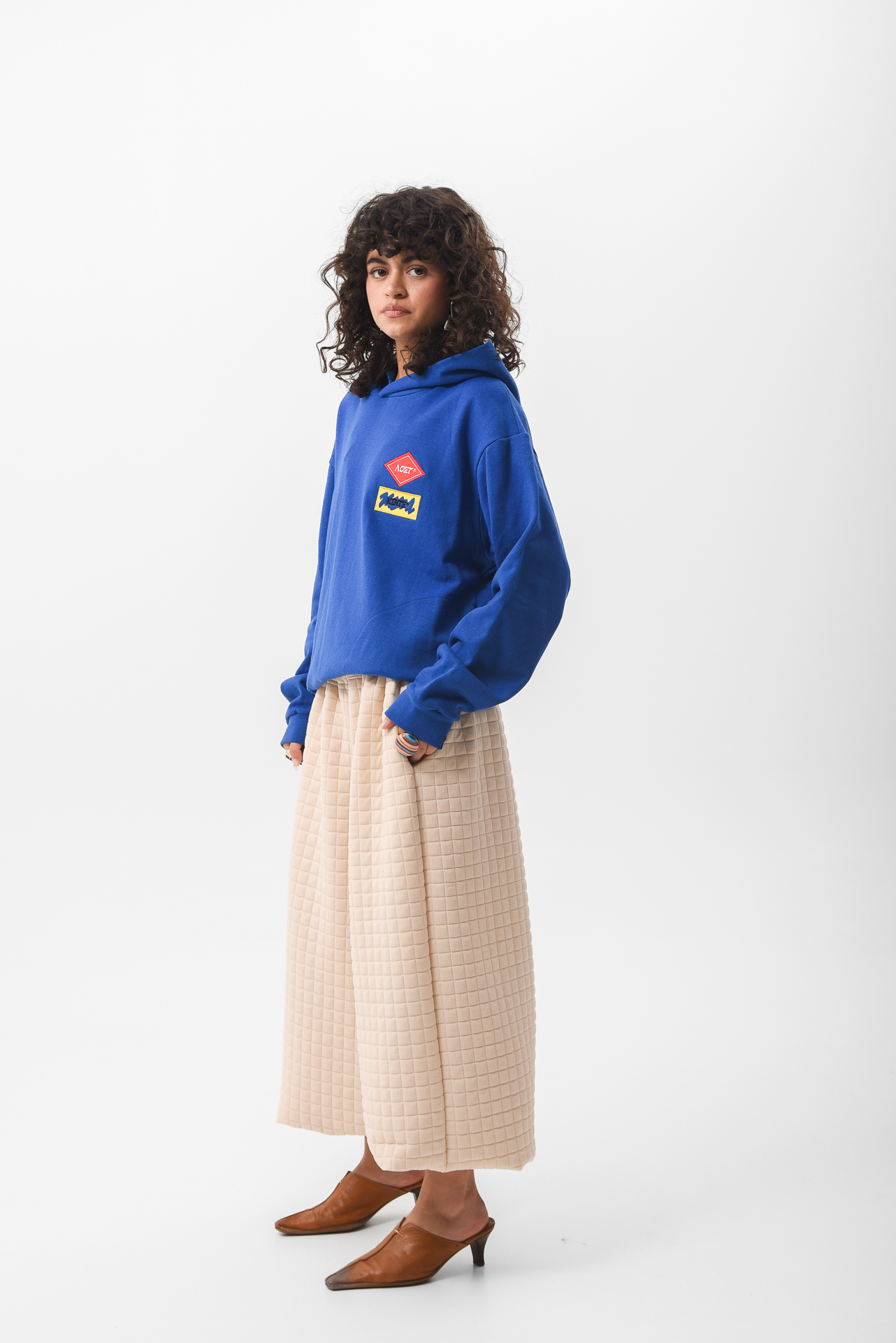 The ΠΩΛΕΙΤΑΙ Ο ΧΑΜΕΝΟΣ Hoodie is a recycled blue piece that carries fragments of everyday Greek and Balkan life, a yiayia’s doily, a komboloi, distinctive greek for sale street posters, and quiet symbols of a culture that’s both lived and performed.