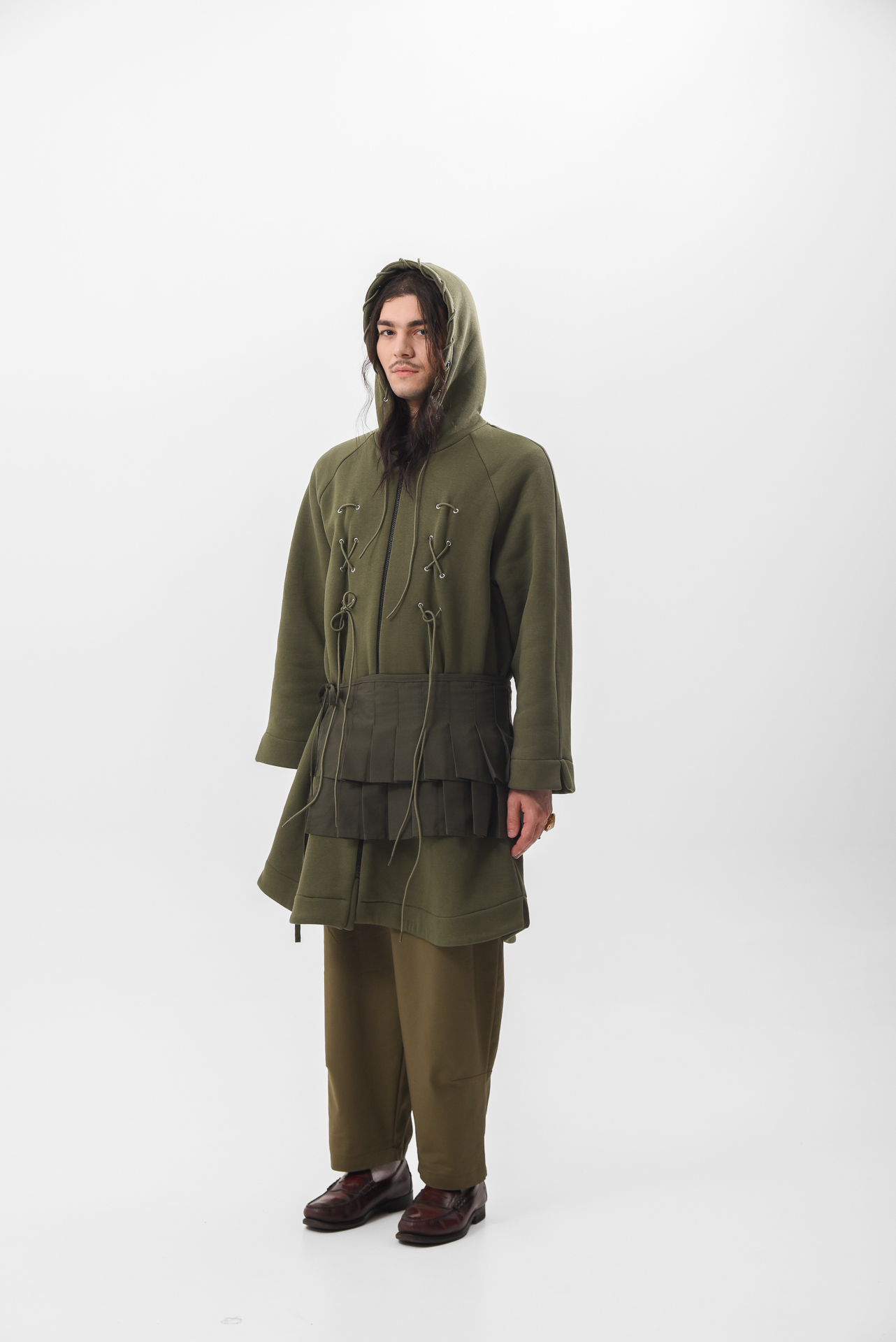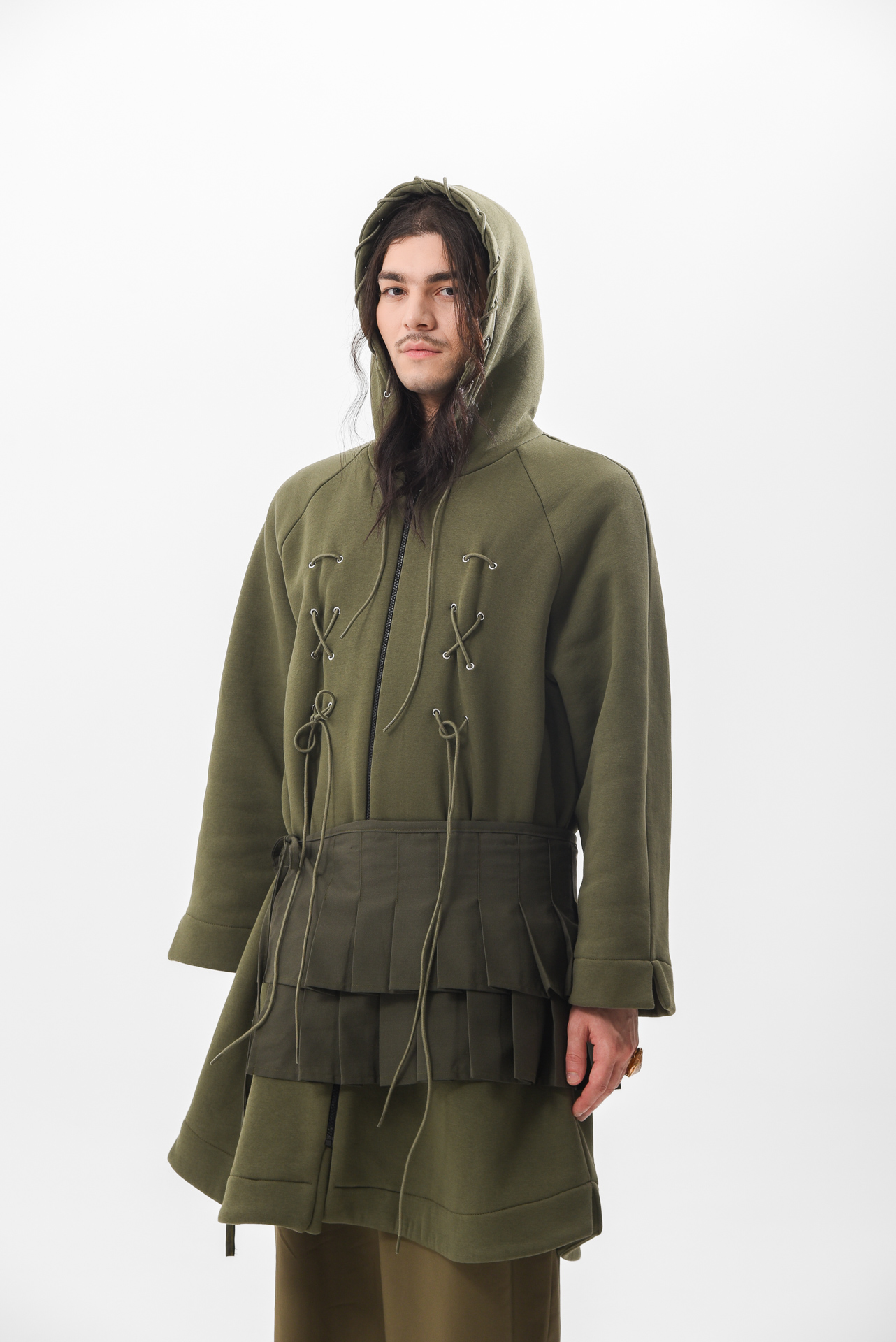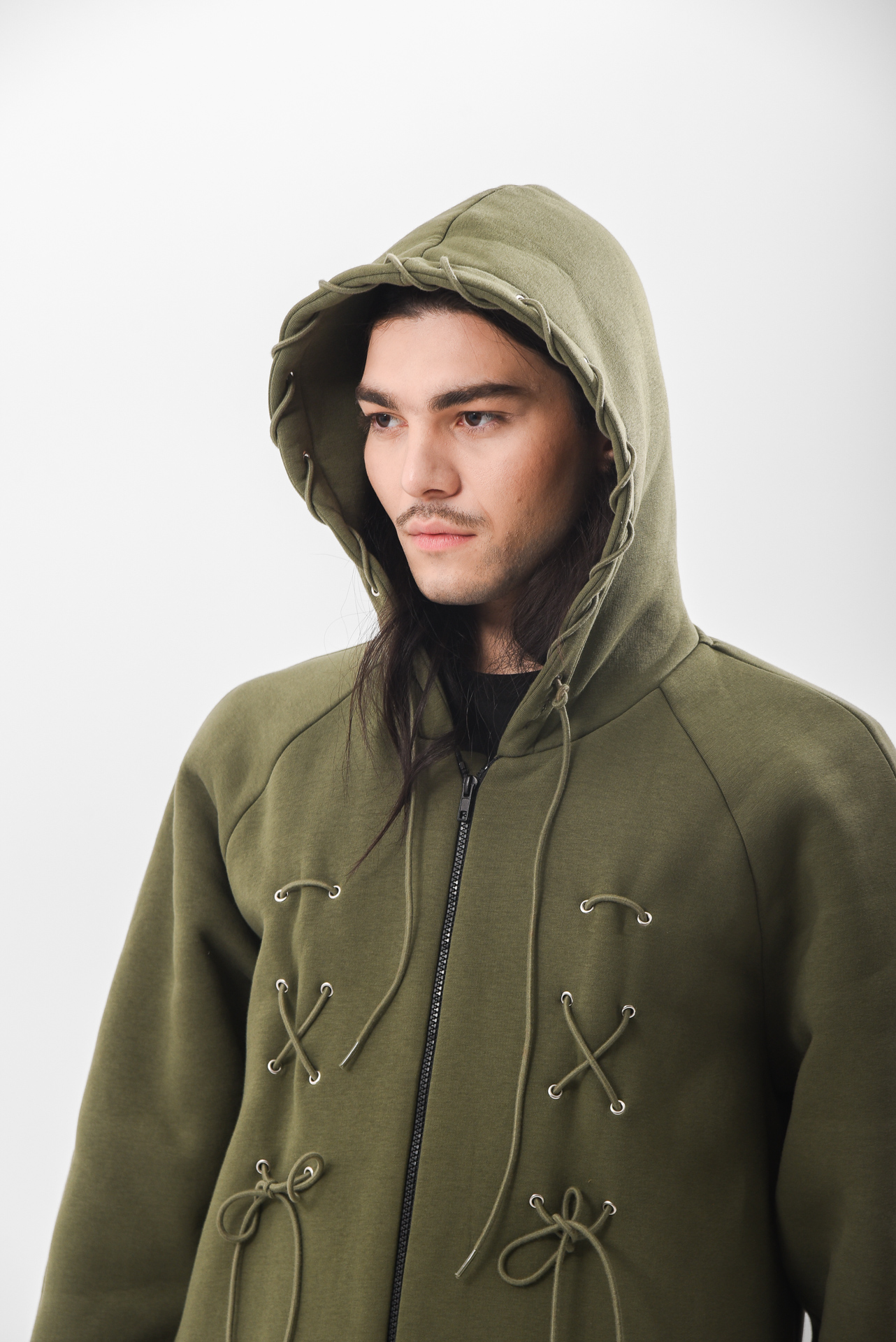 The Medieval Zip Hoodie extends the language of utility into something older, a long khaki silhouette that carries both protection and restraint. A logo patch rests on the back, while the front is pulled together with corset-style lacing, decorative, but never innocent.