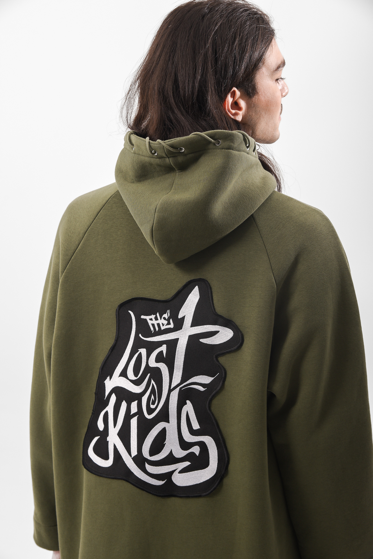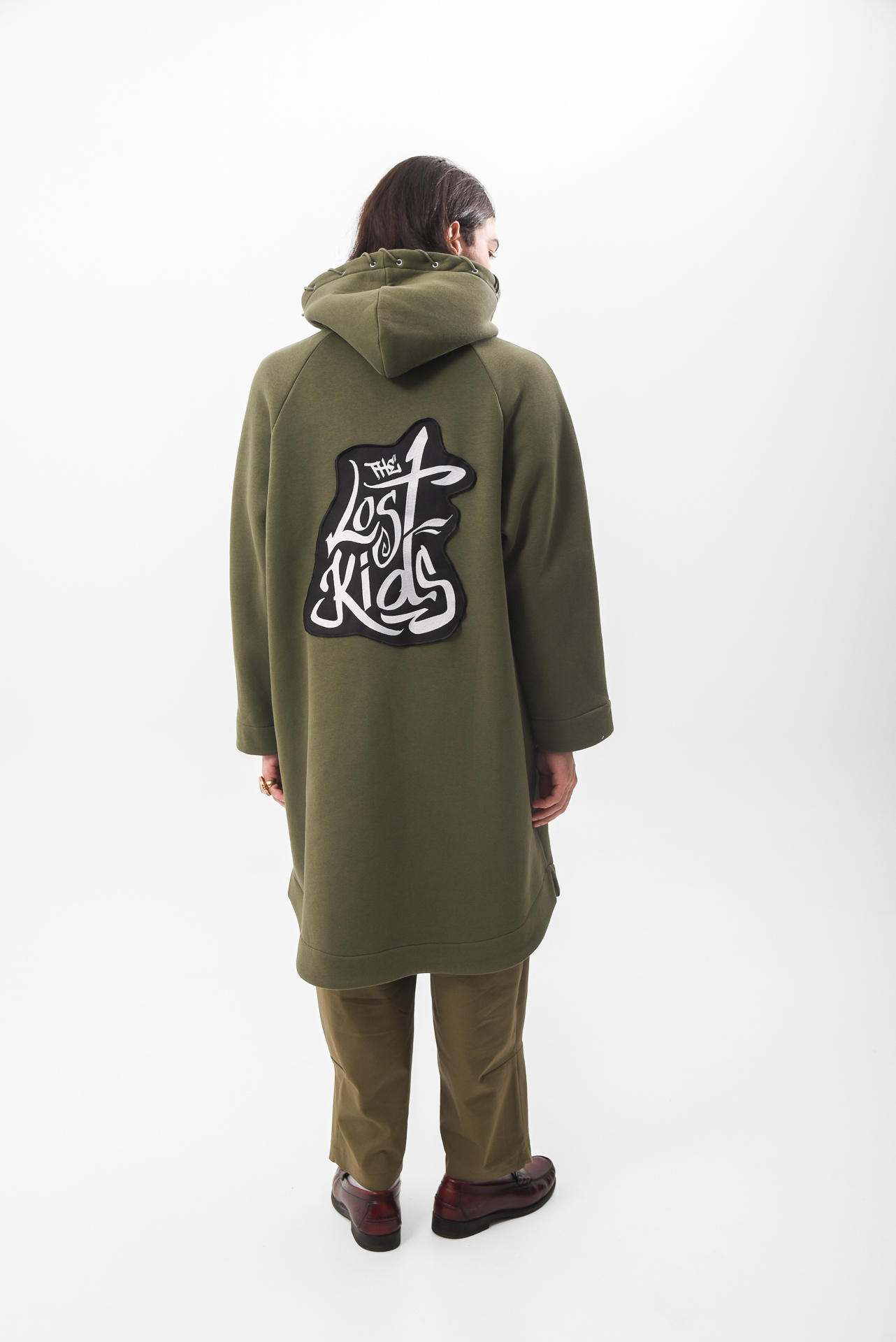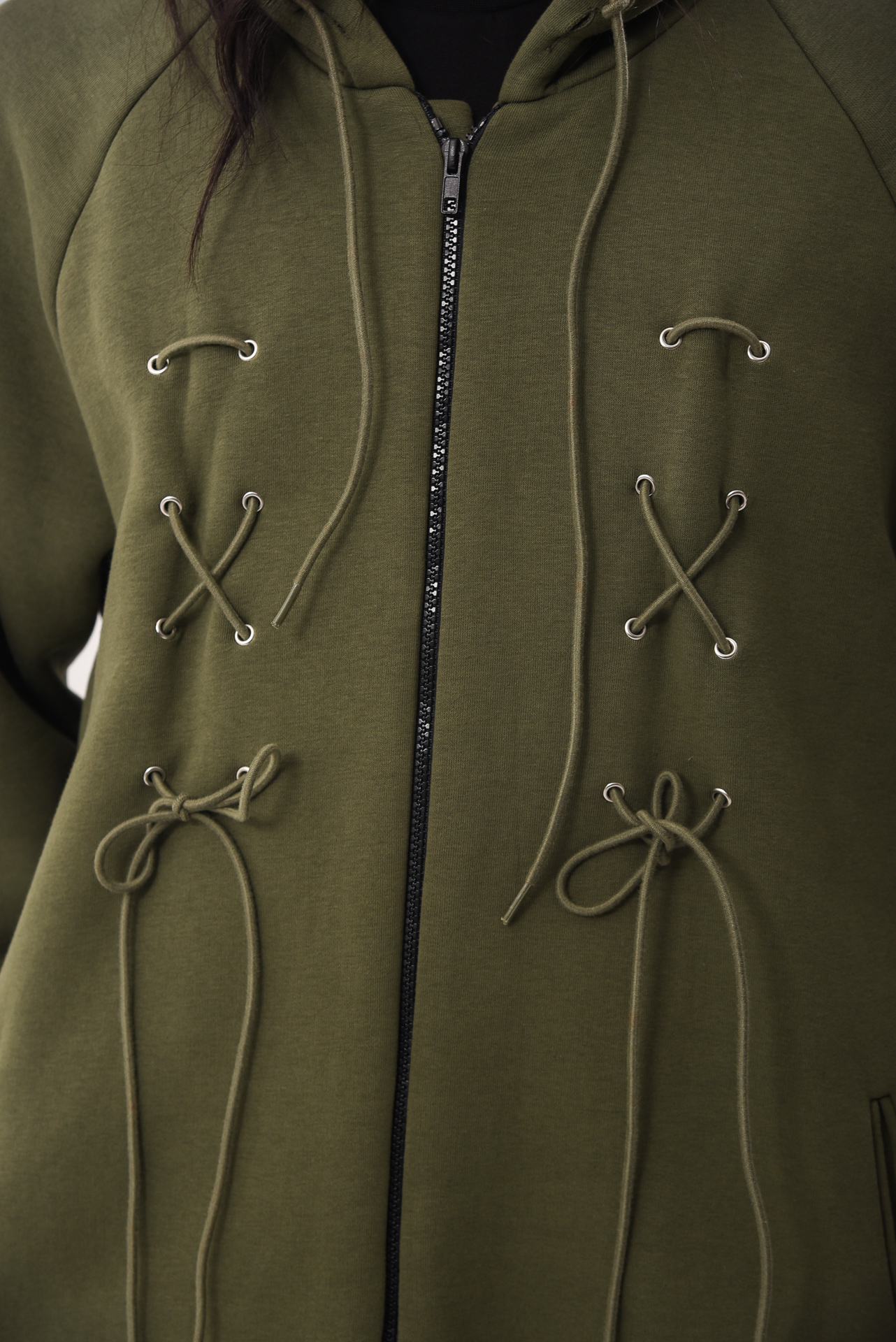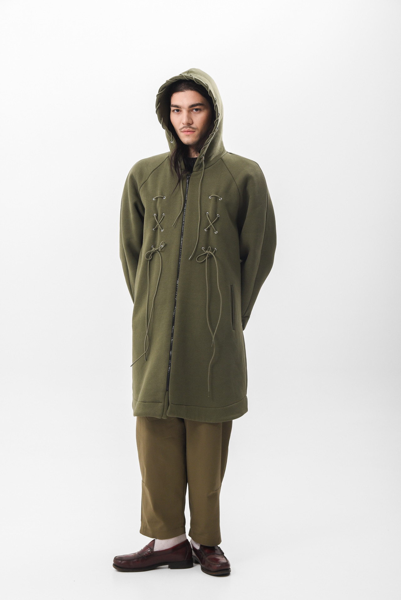 The Medieval Zip Hoodie extends the language of utility into something older, a long khaki silhouette that carries both protection and restraint. A logo patch rests on the back, while the front is pulled together with corset-style lacing, decorative, but never innocent.