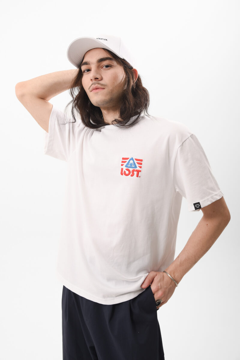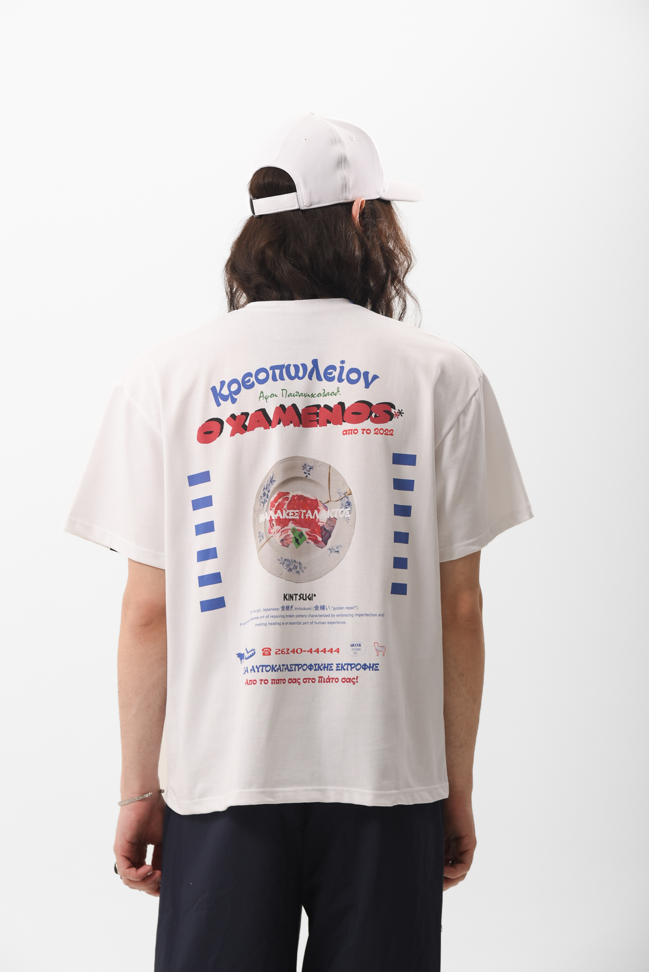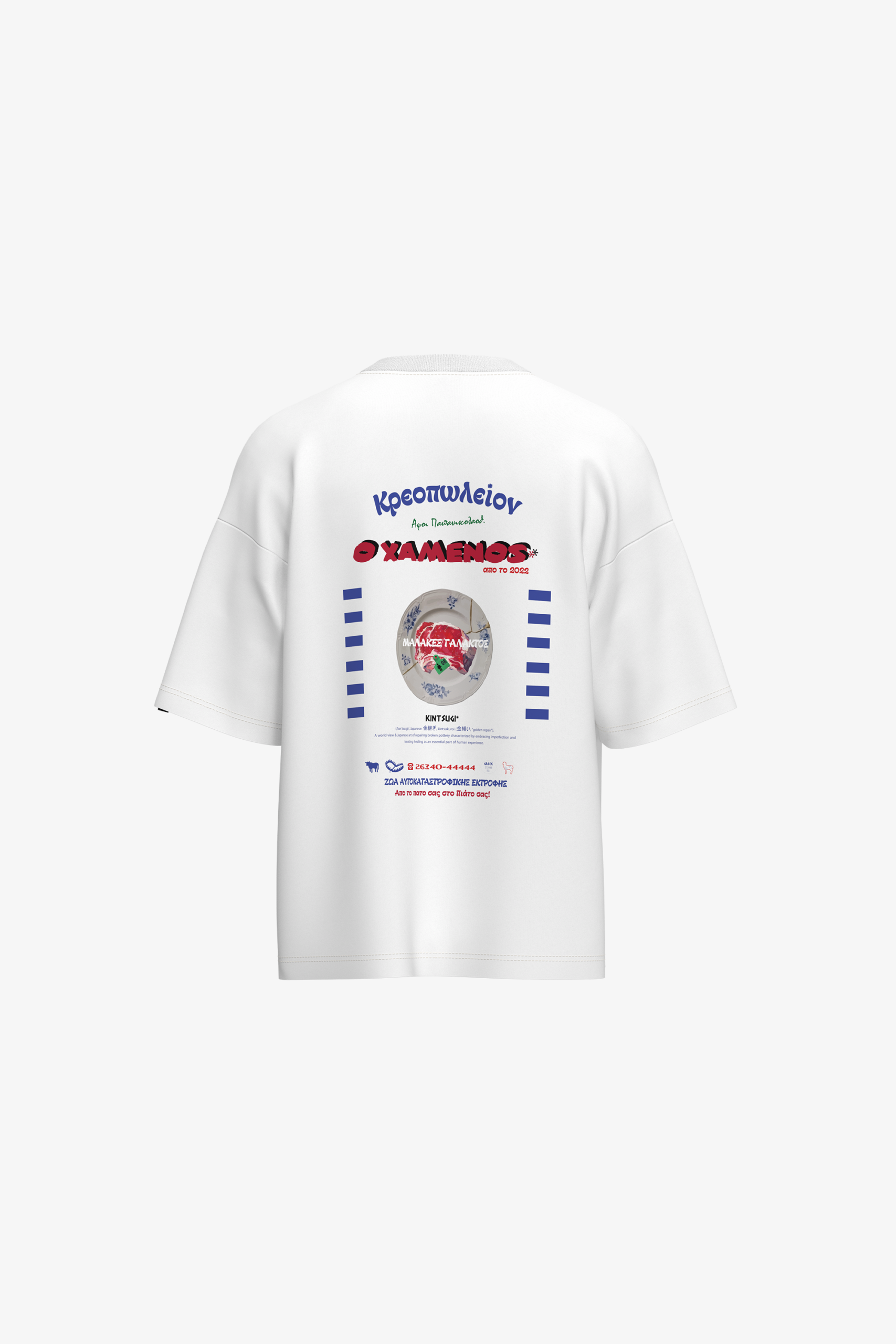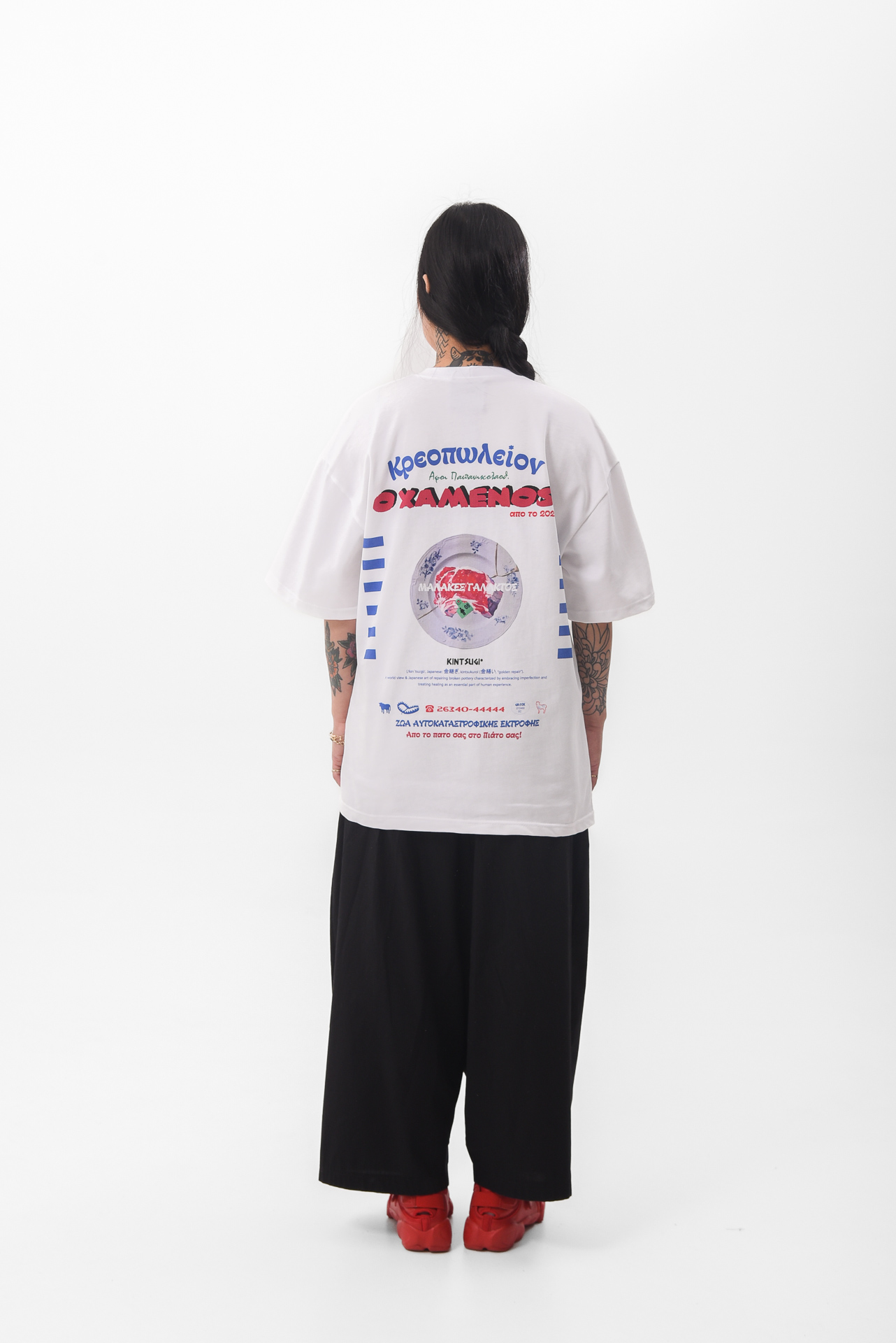 The KREOPOLEIΩN TEE begins softly a small Lost Kid embroidered on the front, whole, untouched, nurtured.