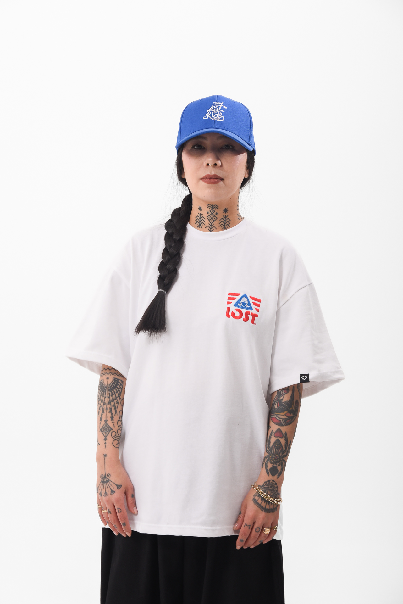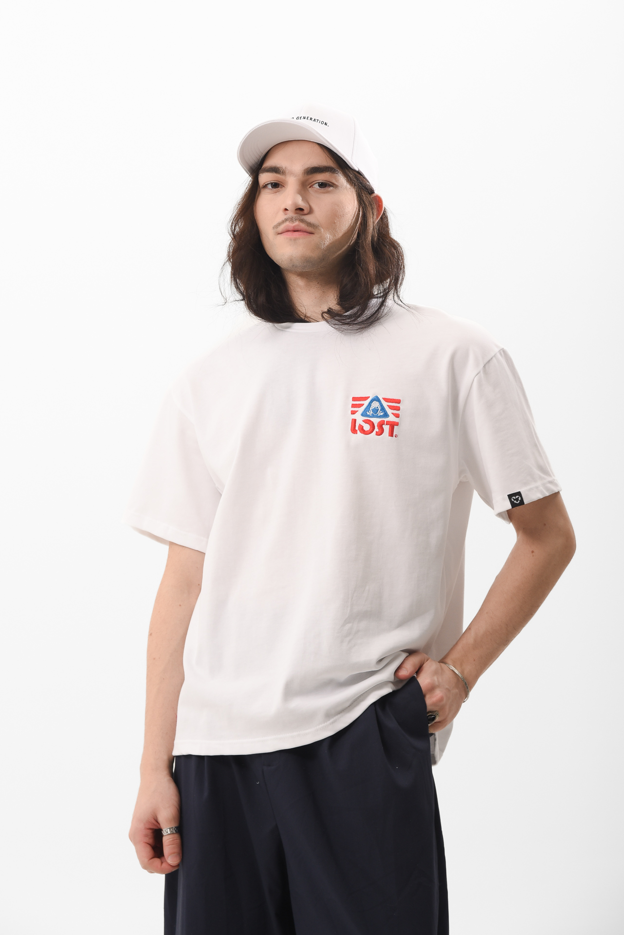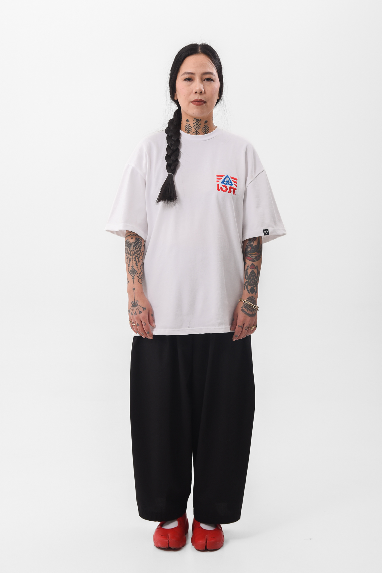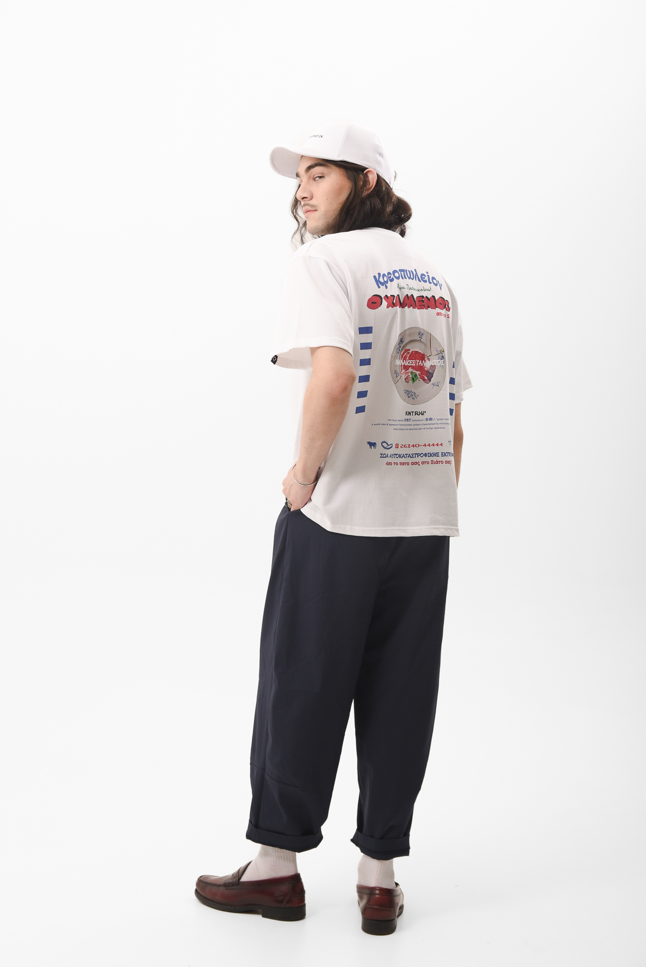 The KREOPOLEIΩN TEE begins softly a small Lost Kid embroidered on the front, whole, untouched, nurtured.