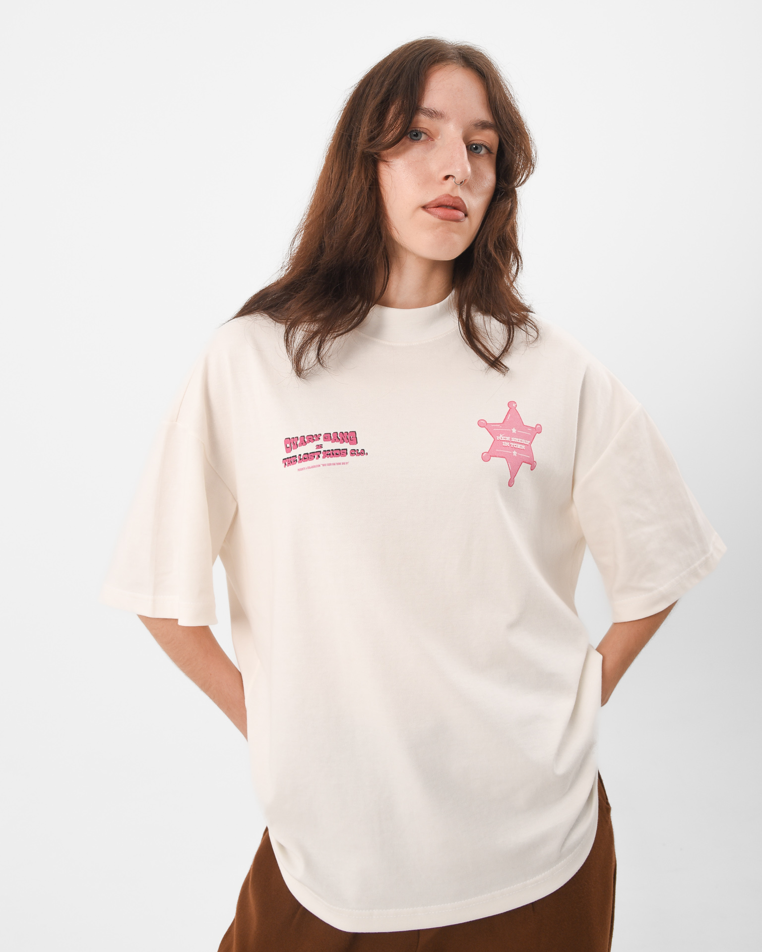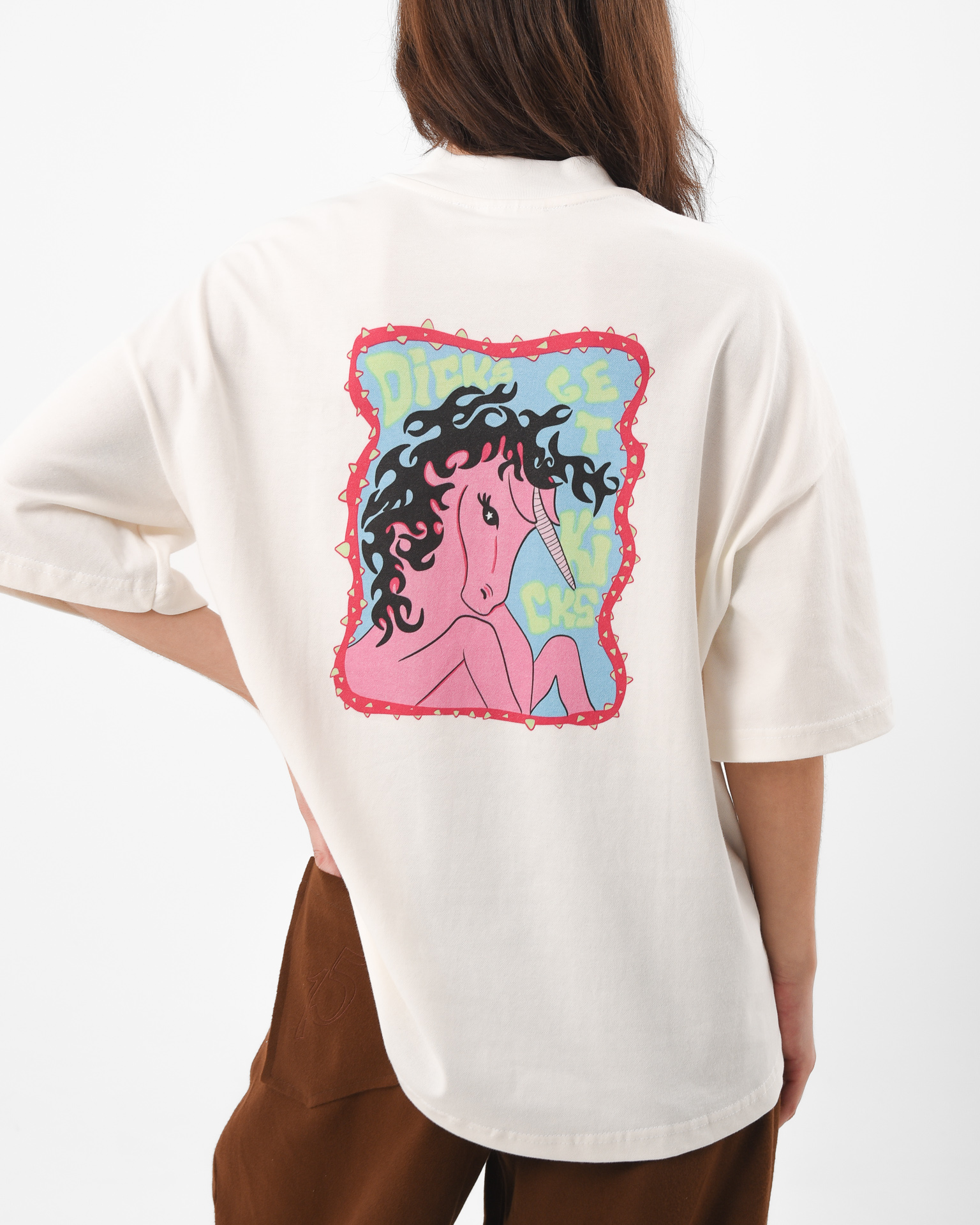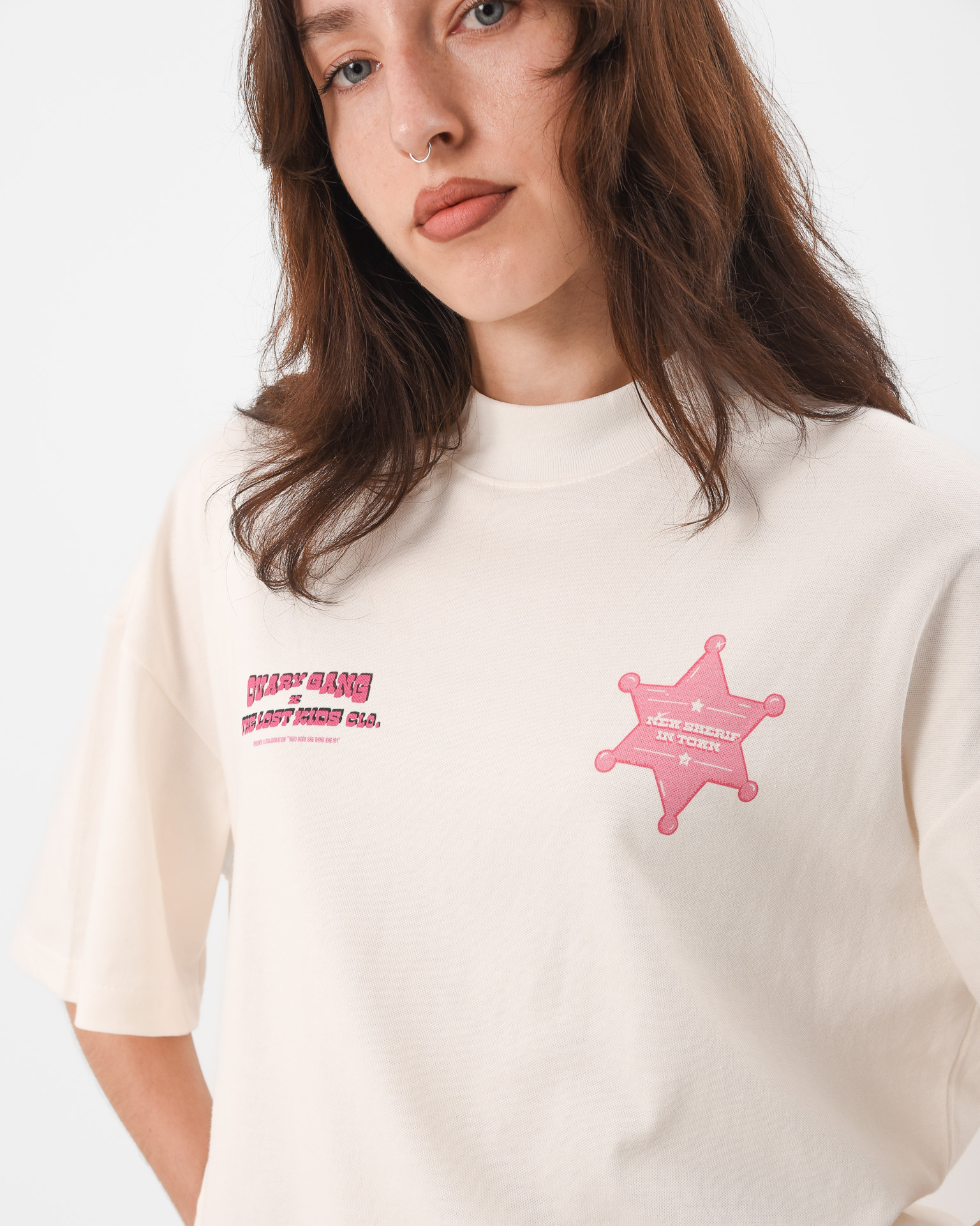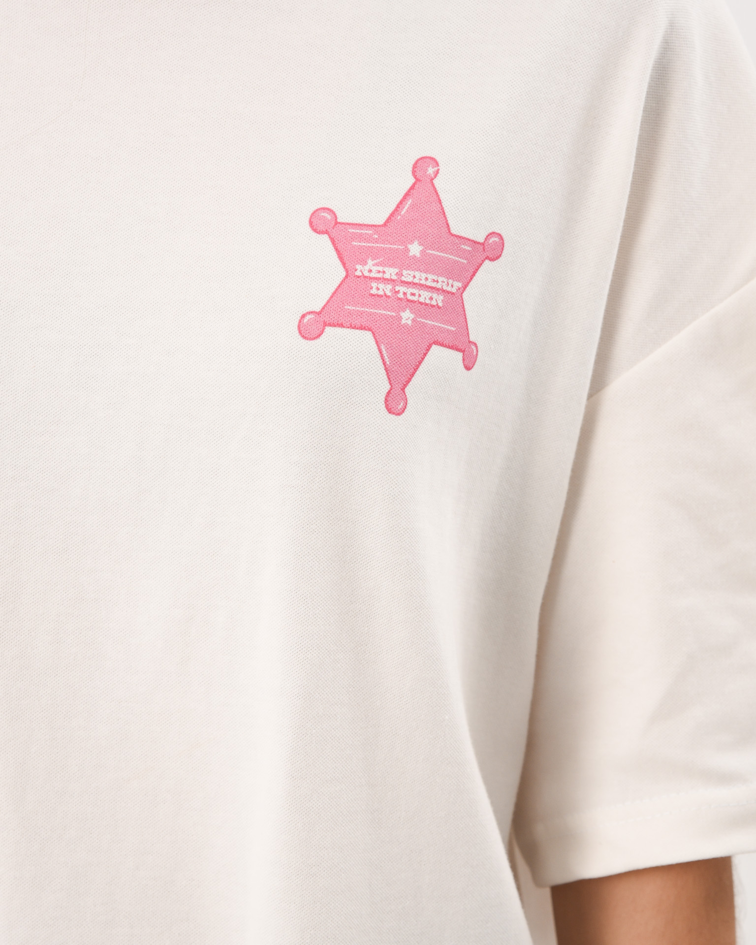 There’s a new law in town and it’s not playing nice. The New Sheriff Tee is an off-white statement piece with a bold front print declaring there is a “New Sheriff in Town” and a cheeky horse illustration on the back stamped with “Dicks Get Kicks.” Its Western rebellion meets street sarcasm, a nod to old-school cowgirls, ego checks, and standing your ground.