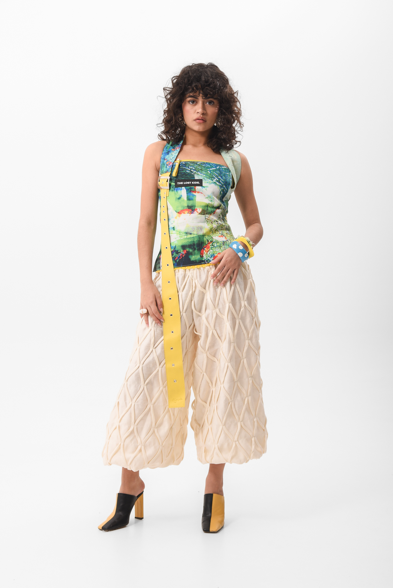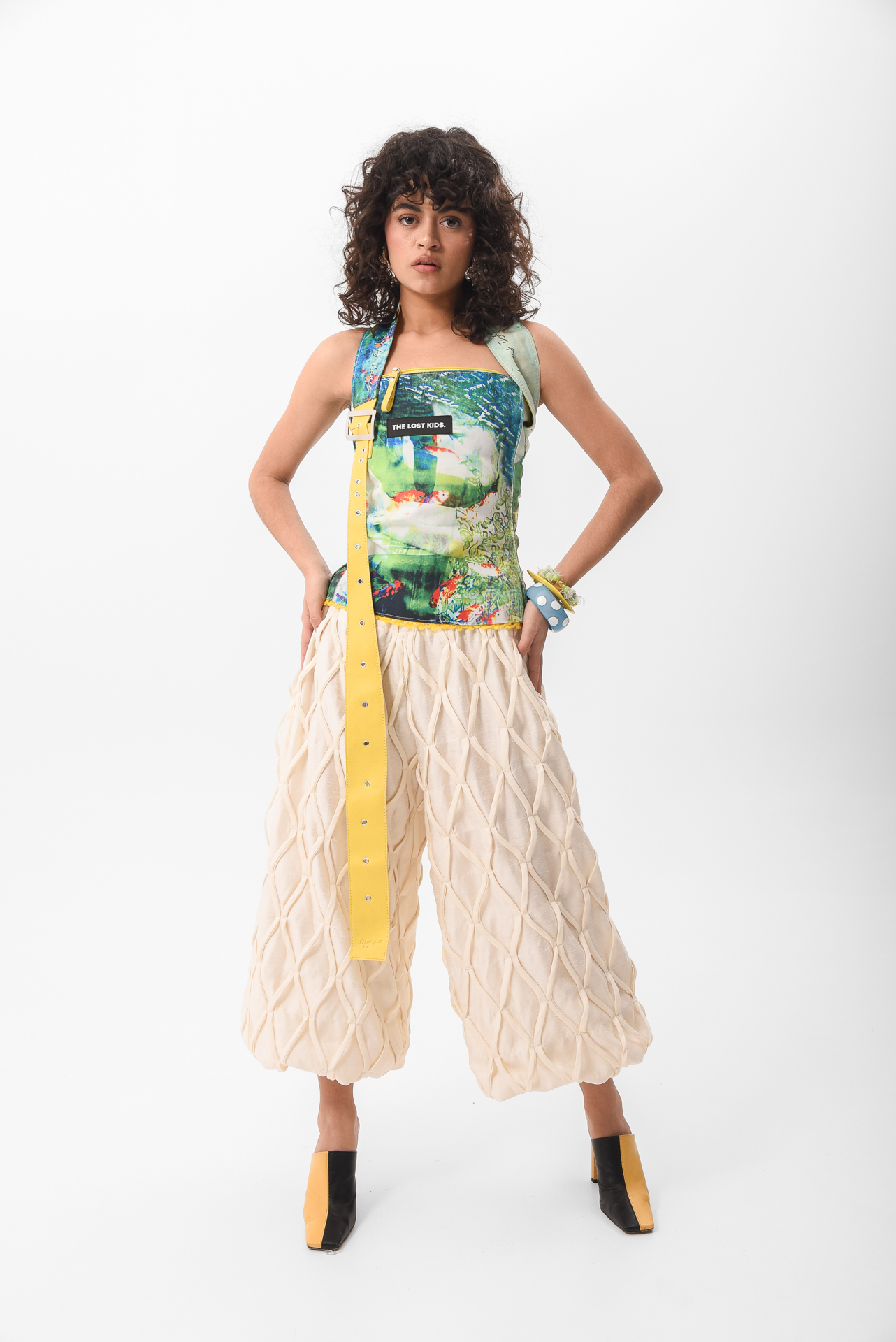 Reworked from a bag and made into a corset, it turns excess into identity, bold, creative, and fully intentional.