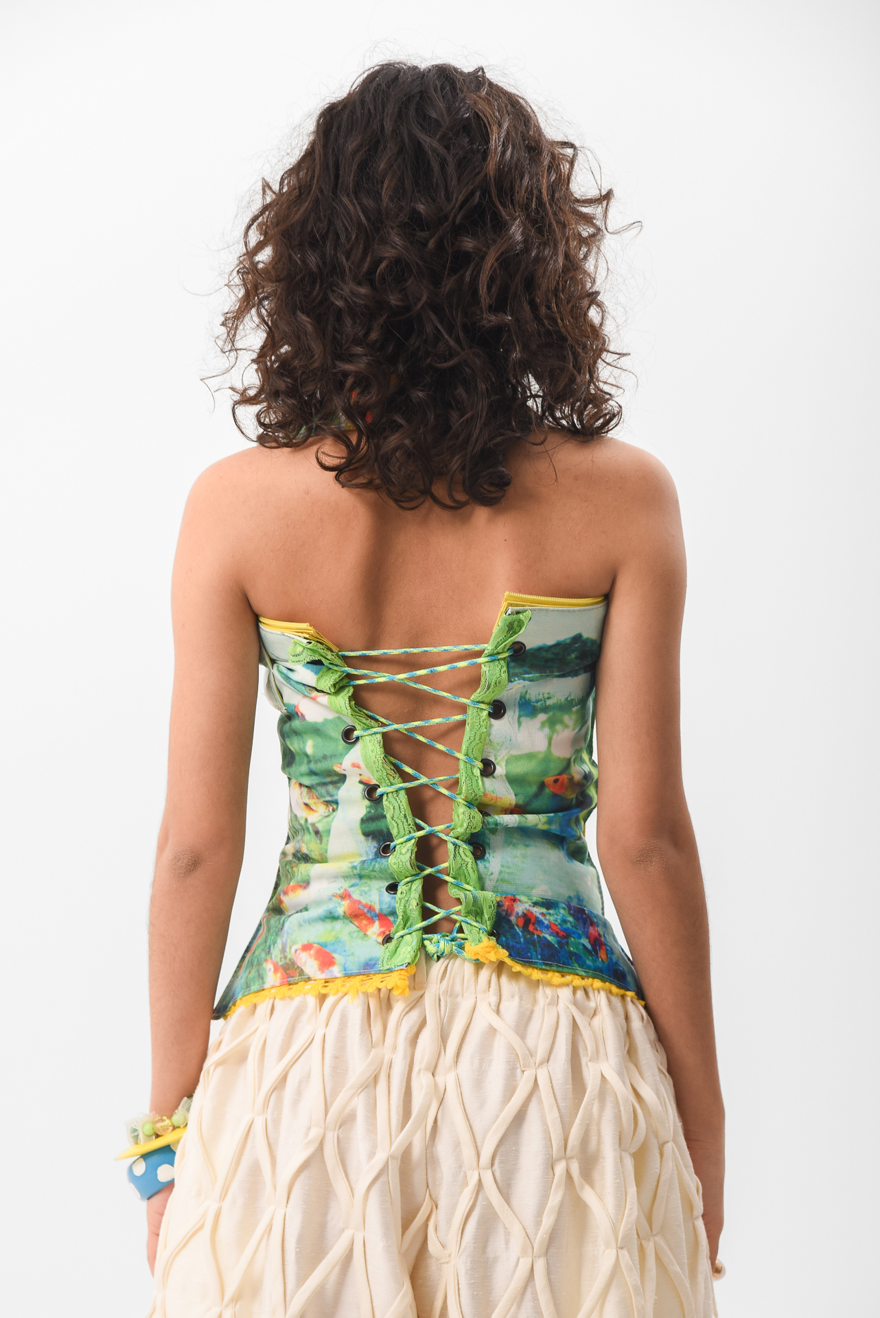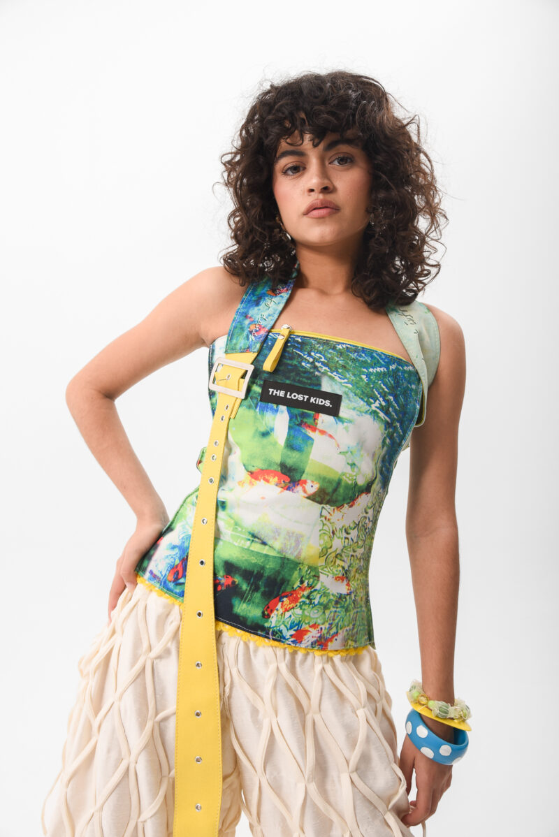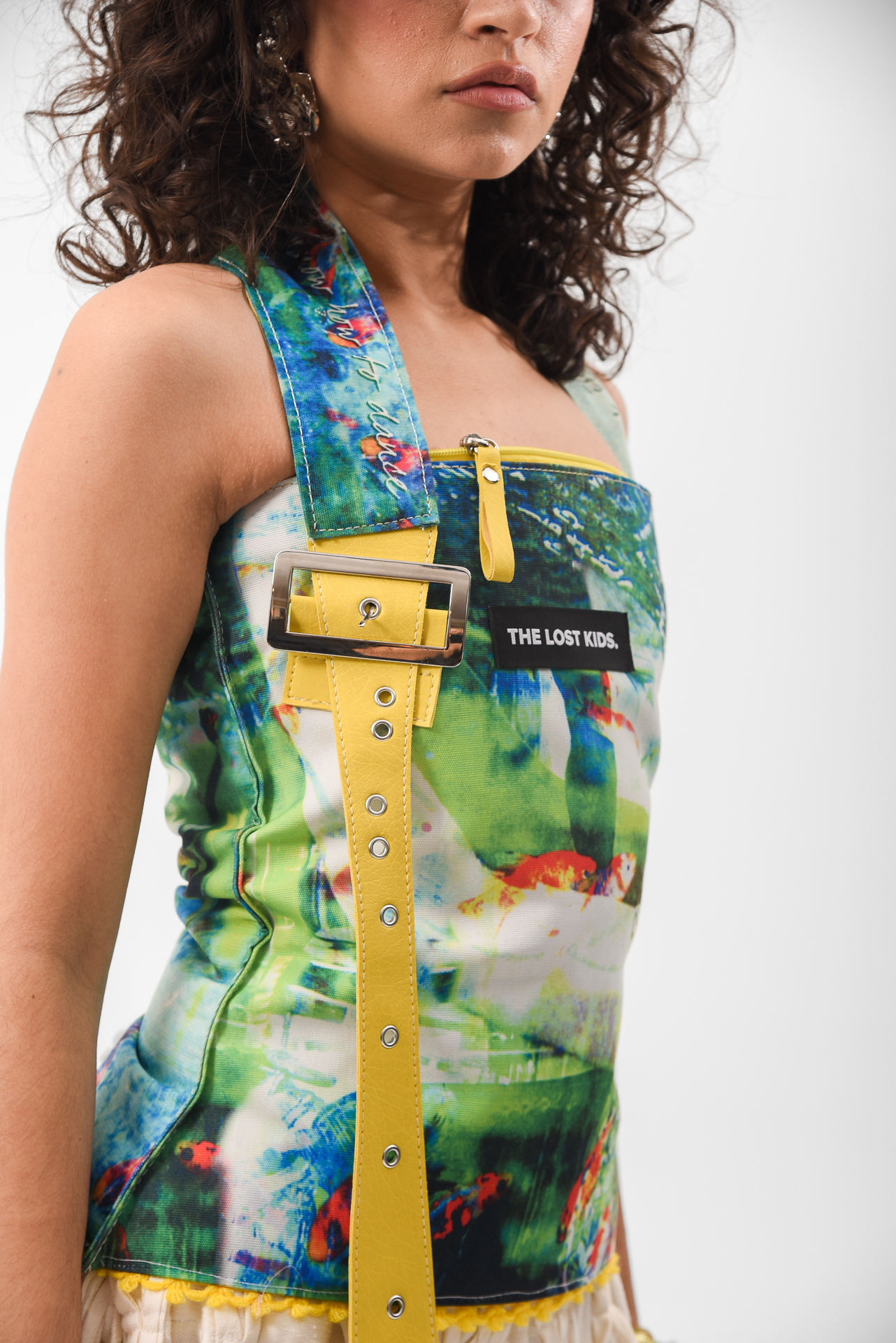 The Main Character Top is made for presence,colorful, expressive, and impossible to ignore. Structured yet playful, it carries the same corset-inspired tension, shaping the body while letting it move freely.